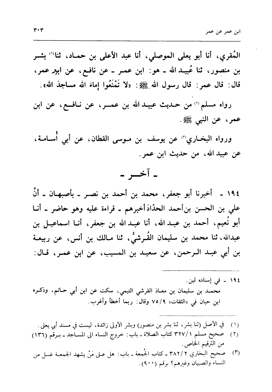١٩٤ - أَخْبَرَنَا أَبُو جَعْفَرٍ مُحَمَّدُ بْنُ أَحْمَدَ بْنِ نَصْرٍ - بِأَصْبَهَانَ - أَنَّ عَلِيَّ بْنَ الْحَسَنِ بْنِ أَحْمَدَ الْحَدَّادَ أَخْبَرَهُمْ - قِرَاءَةً عَلَيْهِ وَهُوَ حَاضِرٌ - أَنَا أَبُو نُعَيْمٍ أَحْمَدُ بْنُ عَبْدِ اللهِ، أَنَا عَبْدُ اللهِ بْنُ جَعْفَرٍ، أَنَا إِسْمَاعِيلُ بْنُ عَبْدِ اللهِ، ثَنَا مُحَمَّدُ بْنُ سُلَيْمَانَ الْقُرَشِيُّ، ثَنَا مَالِكُ بْنُ أَنَسٍ، عَنْ رَبِيعَةَ بْنِ أَبِي عَبْدِ الرَّحْمَنِ، عَنْ سَعِيدِ بْنِ الْمُسَيِّبِ، عَنِ ابْنِ عُمَرَ، قَالَ