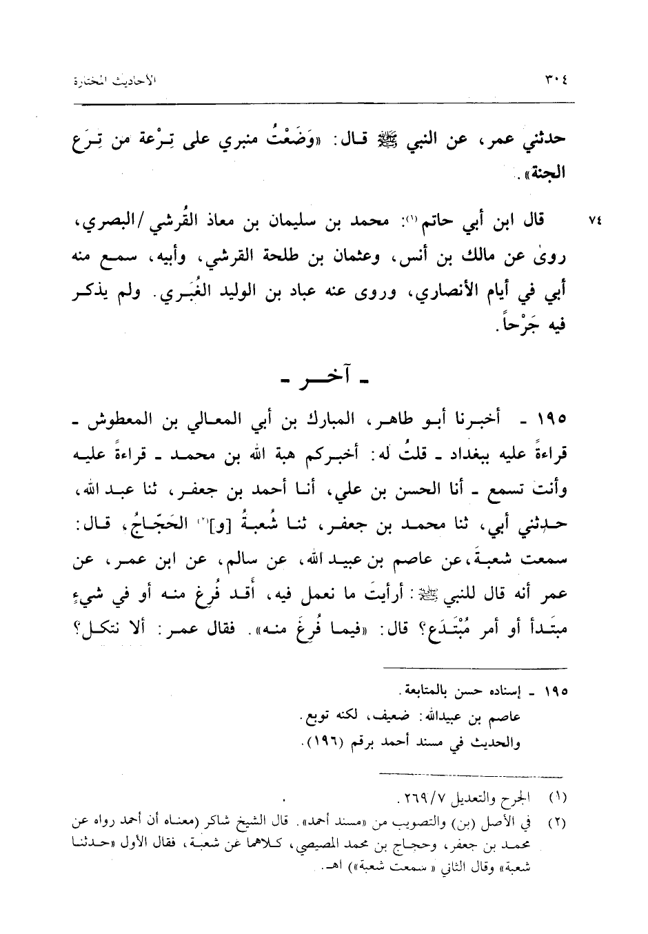 ١٩٥ - أَخْبَرَنَا أَبُو طَاهِرٍ، الْمُبَارَكُ بْنُ أَبِي الْمَعَالِي بْنِ الْمَعْطُوشِ - قِرَاءَةً عَلَيْهِ بِبَغْدَادَ - قُلْتُ لَهُ: أَخْبَرَكُمْ هِبَةُ اللهِ بْنُ مُحَمَّدٍ - قِرَاءَةً عَلَيْهِ وَأَنْتَ تَسْمَعُ - أَنَا الْحَسَنُ بْنُ عَلِيٍّ، أَنَا أَحْمَدُ بْنُ جَعْفَرٍ، ثَنَا عَبْدُ اللهِ، حَدَّثَنِي أَبِي، ثَنَا مُحَمَّدُ بْنُ جَعْفَرٍ، ثَنَا شُعْبَةُ (وَ) الْحَجَّاجُ قَالَ: سَمِعْتُ شُعْبَةَ، عَنْ عَاصِمِ بْنِ عُبَيْدِ اللهِ، عَنْ سَالِمٍ، عَنِ ابْنِ عُمَرَ، عَنْ عُمَرَ أَنَّهُ قَالَ لِلنَّبِيِّ - صَلَّى اللهُ عَلَيْهِ وَسَلَّمَ -: «أَرَأَيْتَ مَا نَعْمَلُ فِيهِ، أَقَدْ فُرِغَ مِنْهُ أَوْ فِي شَيْءٍ مُبْتَدَإٍ أَوْ أَمْرٍ مُبْتَدَعٍ؟ قَالَ: فِيمَا فُرِغَ مِنْهُ، فَقَالَ عُمَرُ، أَلَا نَتَّكِلُ؟