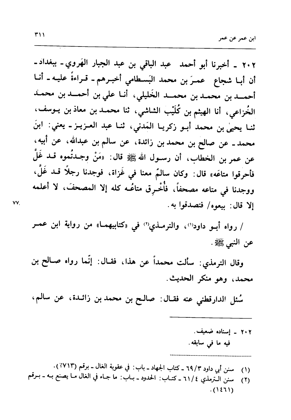 ٢٠٢ - أَخْبَرَنَا أَبُو أَحْمَدَ عَبْدُ الْبَاقِي بْنُ عَبْدِ الْجَبَّارِ الْهَرَوِيُّ - بِبَغْدَادَ - أَنَّ أَبَا شُجَاعٍ عُمَرَ بْنَ مُحَمَّدٍ الْبِسْطَامِيَّ أَخْبَرَهُمْ - قِرَاءَةً عَلَيْهِ - أَنَا أَحْمَدُ بْنُ مُحَمَّدِ بْنِ مُحَمَّدٍ الْخَلِيلِيُّ، أَنَا عَلِيُّ بْنُ أَحْمَدَ بْنِ مُحَمَّدٍ الْخُزَاعِيُّ، أَنَا الْهَيْثَمُ بْنُ كُلَيْبٍ الشَّاشِيُّ، ثَنَا مُحَمَّدُ بْنُ مُعَاذِ بْنِ يُوسُفَ، ثَنَا يَحْيَى بْنُ مُحَمَّدٍ أَبُو زَكَرِيَّا الْمَدَنِيُّ، ثَنَا عَبْدُ الْعَزِيزِ - يَعْنِي: ابْنَ مُحَمَّدٍ - عَنْ صَالِحِ بْنِ مُحَمَّدِ بْنِ زَائِدَةَ، عَنْ سَالِمِ بْنِ عَبْدِ اللهِ عَنْ أَبِيهِ عَنْ عُمَرَ بْنِ الْخَطَّابِ أَنَّ رَسُولَ اللهِ - صَلَّى اللهُ عَلَيْهِ وَسَلَّمَ - قَالَ: «مَنْ وَجَدْتُمُوهُ قَدْ غَلَّ فَأَحْرِقُوا مَتَاعَهُ قَالَ: وَكَانَ سَالِمٌ مَعَنَا فِي غَزَاةٍ، فَوَجَدْنَا رَجُلًا قَدْ غَلَّ، وَوَجَدْنَا فِي مَتَاعِهِ مُصْحَفًا، فَأُحْرِقَ مَتَاعُهُ كُلُّهُ إِلَّا الْمُصْحَفَ لَا أَعْلَمُهُ إِلَّا قَالَ: بِيعُوهُ فَتَصَدَّقُوا بِهِ.»