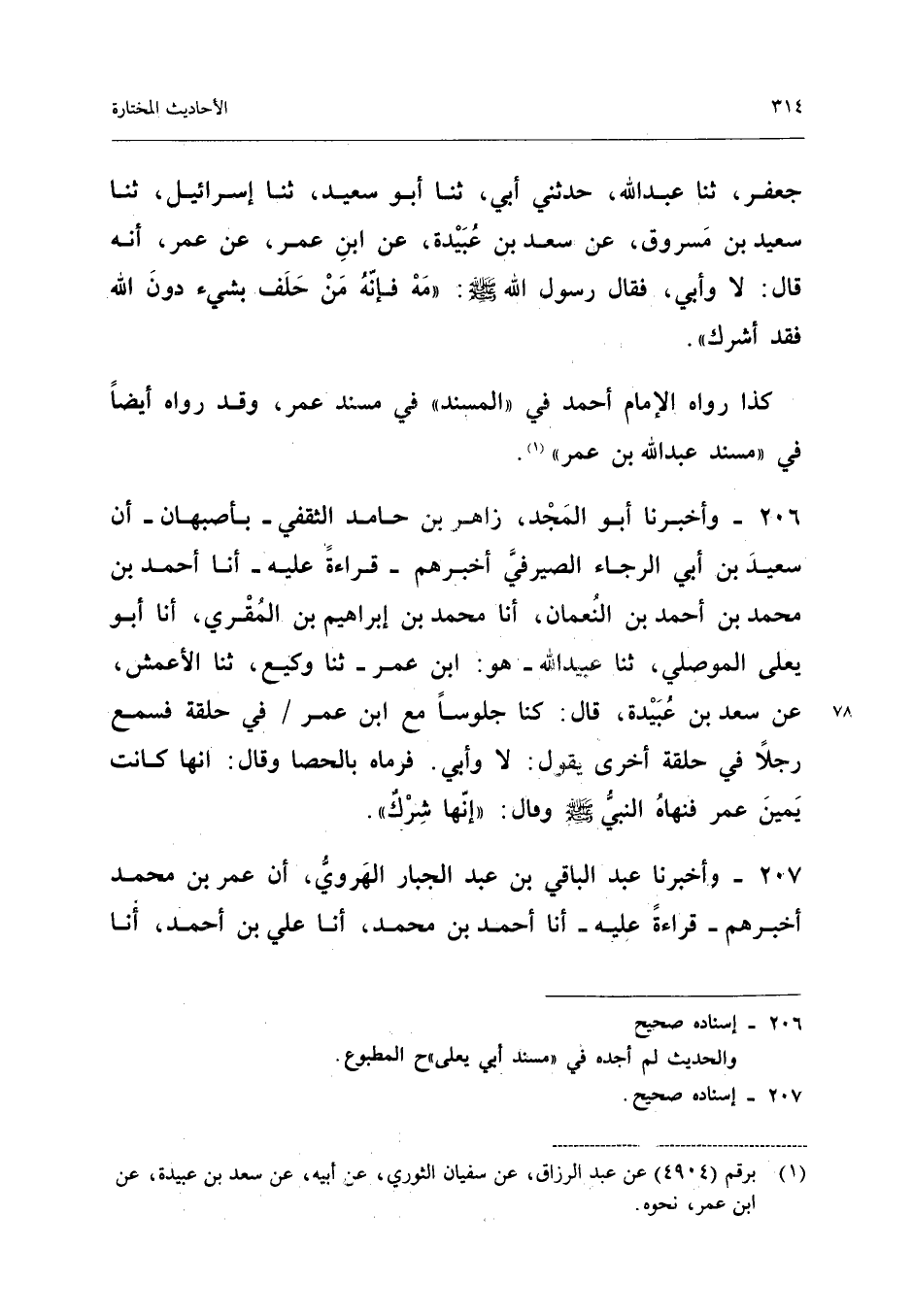 ٢٠٦ - وَأَخْبَرَنَا أَبُو الْمَجْدِ زَاهِرُ بْنُ حَامِدٍ الثَّقَفِيُّ - بِأَصْبَهَانَ - أَنَّ سَعِيدَ بْنَ أَبِي الرَّجَاءِ الصَّيْرَفِيَّ أَخْبَرَهُمْ - قِرَاءَةً عَلَيْهِ - أَنَا أَحْمَدُ بْنُ مُحَمَّدِ بْنِ أَحْمَدَ بْنِ النُّعْمَانِ، أَنَا مُحَمَّدُ بْنُ إِبْرَاهِيمَ بْنِ الْمُقْرِي، أَنَا أَبُو يَعْلَى الْمَوْصِلِيُّ، ثَنَا عُبَيْدُ اللهِ - هُوَ: ابْنُ عُمَرَ - ثَنَا وَكِيعٌ، ثَنَا الْأَعْمَشُ، عَنْ سَعْدِ بْنِ عُبَيْدَةَ قَالَ: «كُنَّا جُلُوسًا مَعَ ابْنِ عُمَرَ فِي حَلْقَةٍ فَسَمِعَ رَجُلًا فِي حَلْقَةٍ أُخْرَى يَقُولُ: لَا وَأَبِي فَرَمَاهُ بِالْحَصَا، وَقَالَ: إِنَّهَا كَانَتْ يَمِينَ عُمَرَ فَنَهَاهُ النَّبِيُّ - صَلَّى اللهُ عَلَيْهِ وَسَلَّمَ - وَقَالَ: إِنَّهَا شِرْكٌ».