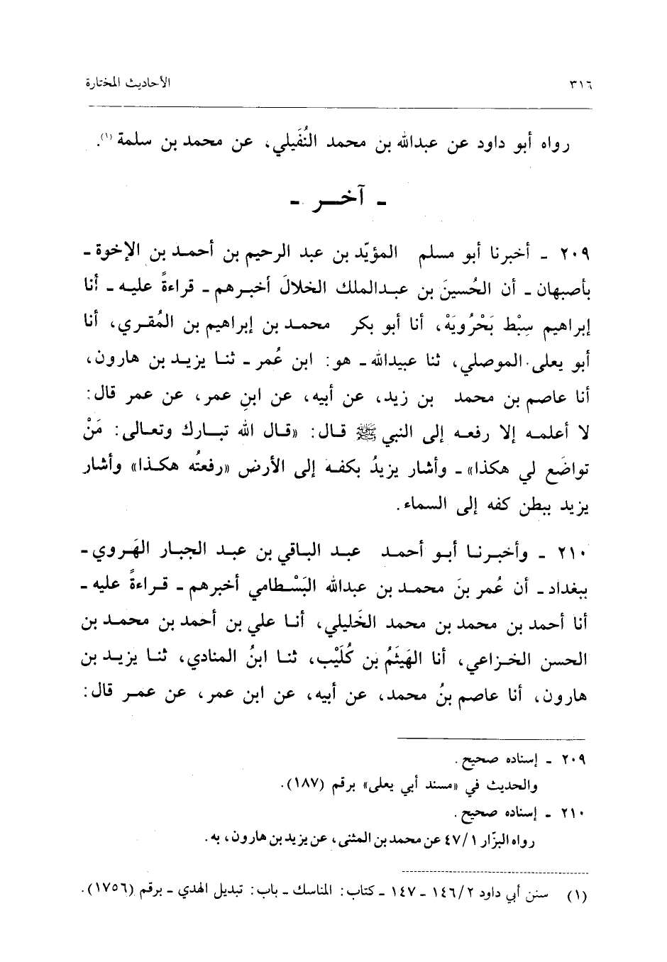 ٢٠٩ - أَخْبَرَنَا أَبُو مُسْلِمٍ الْمُؤَيَّدُ بْنُ عَبْدِ الرَّحِيمِ بْنِ أَحْمَدَ بْنِ الْإِخْوَةِ - بِأَصْبَهَانَ - أَنَّ الْحُسَيْنَ بْنَ عَبْدِ الْمَلِكِ الْخَلَّالَ أَخْبَرَهُمْ - قِرَاءَةً عَلَيْهِ - أَنَا إِبْرَاهِيمُ سِبْطُ بَحْرَوَيْهِ، أَنَا أَبُو بَكْرٍ مُحَمَّدُ بْنُ إِبْرَاهِيمَ بْنِ الْمُقْرِي، أَنَا أَبُو يَعْلَى الْمَوْصِلِيُّ، ثَنَا عُبَيْدُ اللهِ - هُوَ: ابْنُ عُمَرَ - ثَنَا يَزِيدُ بْنُ هَارُونَ، أَنَا عَاصِمُ بْنُ مُحَمَّدِ بْنِ زَيْدٍ عَنْ أَبِيهِ عَنِ ابْنِ عُمَرَ، عَنْ عُمَرَ قَالَ: لَا أَعْلَمُهُ إِلَّا رَفَعَهُ إِلَى النَّبِيِّ - صَلَّى اللهُ عَلَيْهِ وَسَلَّمَ - قَالَ: قَالَ اللهُ تَبَارَكَ وَتَعَالَى: «مَنْ تَوَاضَعَ لِي هَكَذَا. وَأَشَارَ يَزِيدُ بِكَفِّهِ إِلَى الْأَرْضِ - رَفَعْتُهُ هَكَذَا - وَأَشَارَ يَزِيدُ بِبَطْنِ كَفِّهِ إِلَى السَّمَاءِ».