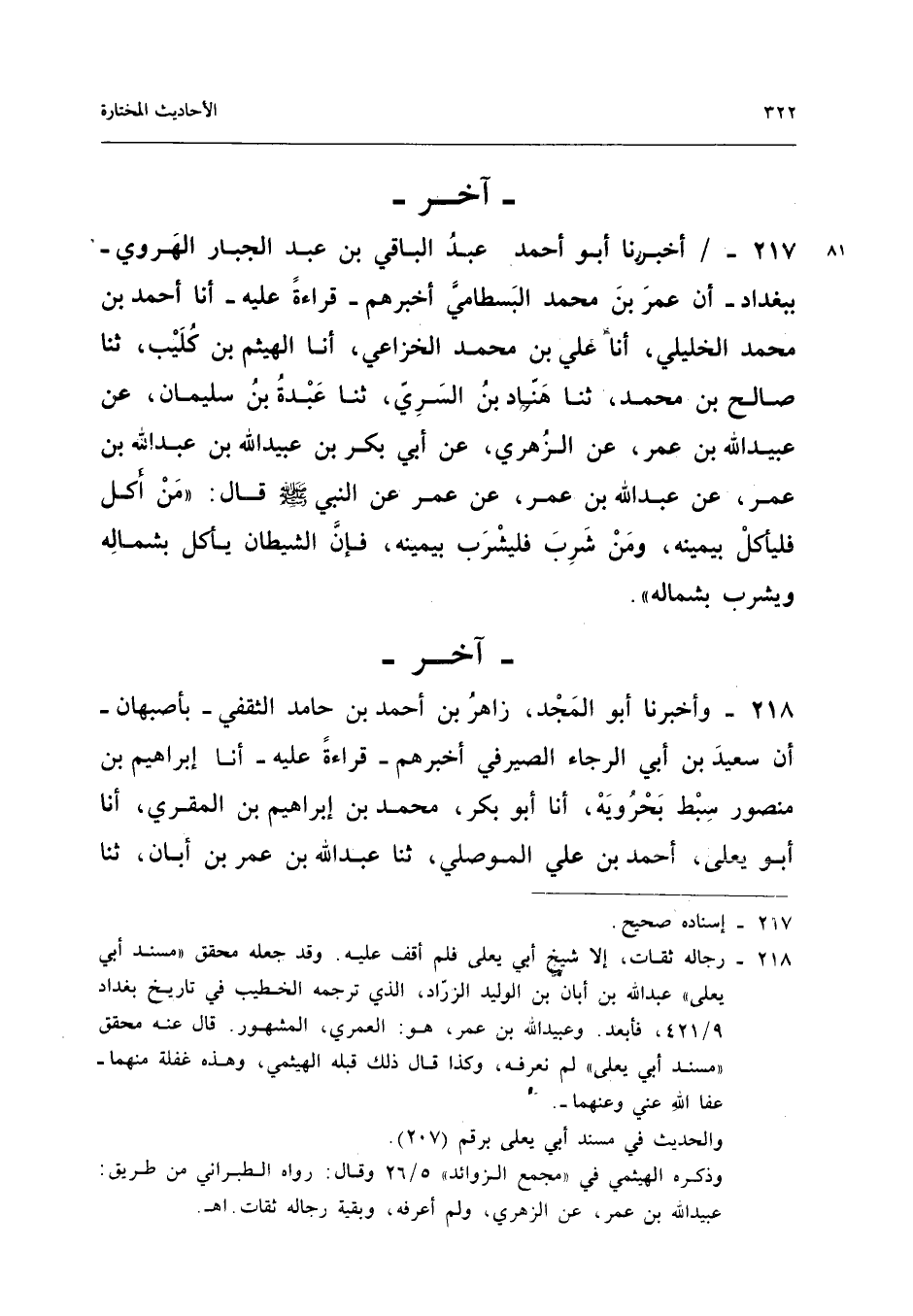 ٢١٧ - أَخْبَرَنَا أَبُو أَحْمَدَ عَبْدُ الْبَاقِي بْنُ عَبْدِ الْجَبَّارِ الْهَرَوِيُّ - بِبَغْدَادَ - أَنَّ عُمَرَ بْنَ مُحَمَّدٍ الْبِسْطَامِيَّ أَخْبَرَهُمْ - قِرَاءَةً عَلَيْهِ - أَنَا أَحْمَدُ بْنُ مُحَمَّدٍ الْخَلِيلِيُّ، أَنَا عَلِيُّ بْنُ مُحَمَّدٍ الْخُزَاعِيُّ، أَنَا الْهَيْثَمُ بْنُ كُلَيْبٍ، ثَنَا صَالِحُ بْنُ مُحَمَّدٍ، ثَنَا هَنَّادُ بْنُ السَّرِيِّ، ثَنَا عَبْدَةُ بْنُ سُلَيْمَانَ، عَنْ عُبَيْدِ اللهِ بْنِ عُمَرَ، عَنِ الزُّهْرِيِّ، عَنْ أَبِي بَكْرِ بْنِ عُبَيْدِ اللهِ بْنِ عَبْدِ اللهِ بْنِ عُمَرَ، عَنْ عَبْدِ اللهِ بْنِ عُمَرَ، عَنْ عُمَرَ، عَنِ النَّبِيِّ - صَلَّى اللهُ عَلَيْهِ وَسَلَّمَ - قَالَ: «مَنْ أَكَلَ فَلْيَأْكُلْ بِيَمِينِهِ، وَمَنْ شَرِبَ فَلْيَشْرَبْ بِيَمِينِهِ، فَإِنَّ الشَّيْطَانَ يَأْكُلُ بِشِمَالِهِ، وَيَشْرَبُ بِشِمَالِهِ».