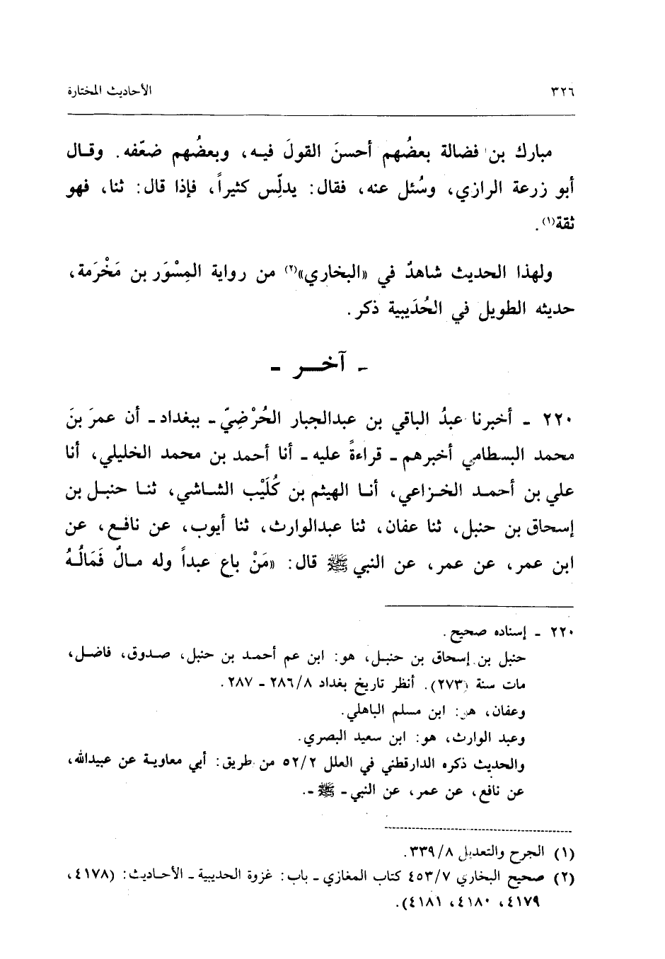 ٢٢٠ - أَخْبَرَنَا عَبْدُ الْبَاقِي بْنُ عَبْدِ الْجَبَّارِ الْحُرْضِيُّ بِبَغْدَادَ أَنَّ عُمَرَ بْنَ مُحَمَّدٍ الْبِسْطَامِيَّ أَخْبَرَهُمْ - قِرَاءَةً عَلَيْهِ - أَنَا أَحْمَدُ بْنُ مُحَمَّدٍ الْخَلِيلِيُّ، أَنَا عَلِيُّ بْنُ أَحْمَدَ الْخُزَاعِيُّ، أَنَا الْهَيْثَمُ بْنُ كُلَيْبٍ الشَّاشِيُّ، ثَنَا حَنْبَلُ بْنُ إِسْحَاقَ بْنِ حَنْبَلٍ، ثَنَا عَفَّانُ، ثَنَا عَبْدُ الْوَارِثِ، ثَنَا أَيُّوبُ، عَنْ نَافِعٍ، عَنِ ابْنِ عُمَرَ، عَنْ عُمَرَ، عَنِ النَّبِيِّ - صَلَّى اللهُ عَلَيْهِ وَسَلَّمَ - قَالَ: «مَنْ بَاعَ عَبْدًا وَلَهُ مَالٌ فَمَالُهُ