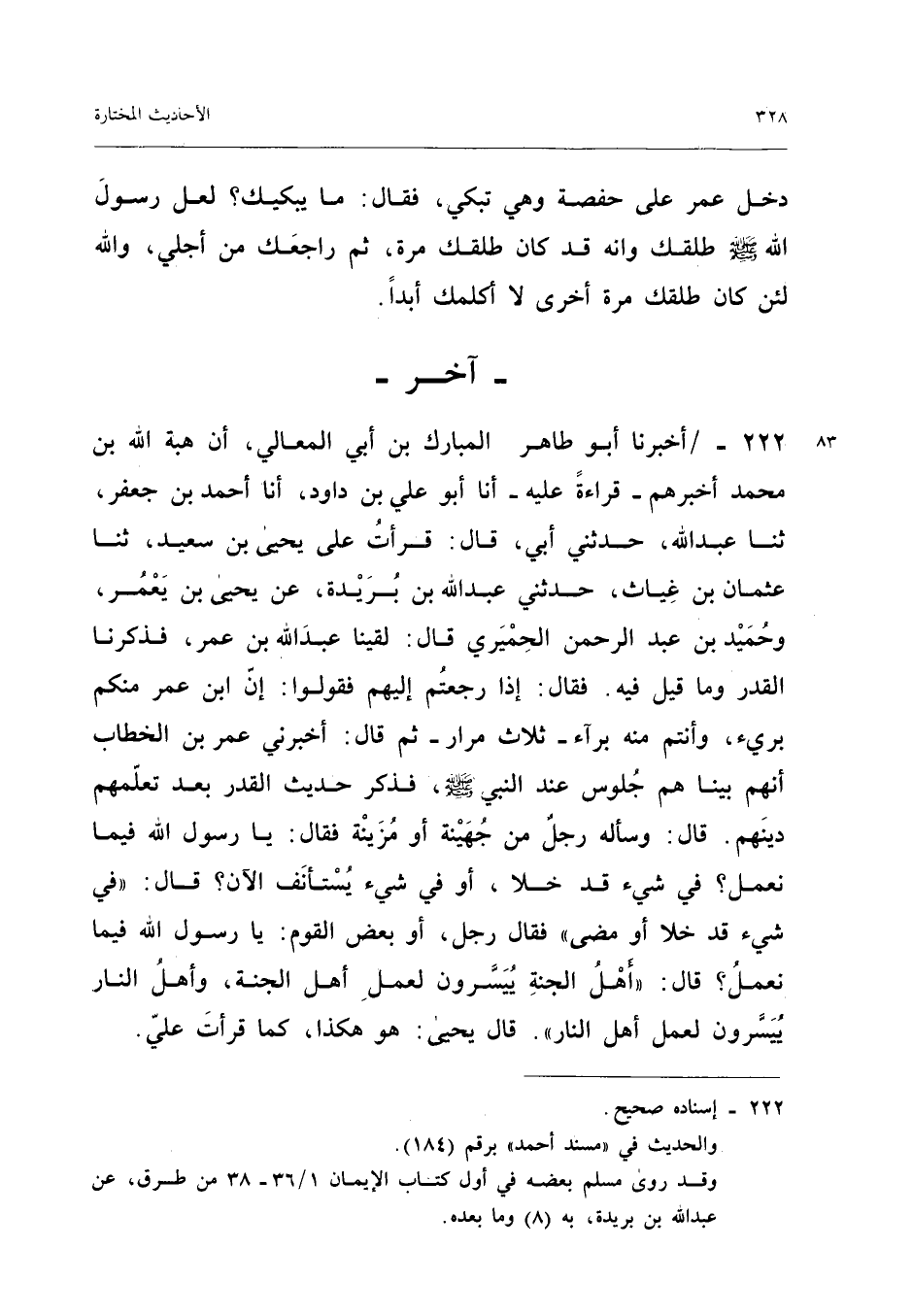 ٢٢٢ - أَخْبَرَنَا أَبُو طَاهِرٍ الْمُبَارَكُ بْنُ أَبِي الْمَعَالِي، أَنَّ هِبَةَ اللهِ بْنَ مُحَمَّدٍ أَخْبَرَهُمْ - قِرَاءَةً عَلَيْهِ - أَنَا أَبُو عَلِيِّ بْنُ دَاوُدَ، أَنَا أَحْمَدُ بْنُ جَعْفَرٍ، ثَنَا عَبْدُ اللهِ، حَدَّثَنِي أَبِي قَالَ: قَرَأْتُ عَلَى يَحْيَى بْنِ سَعِيدٍ، ثَنَا عُثْمَانُ بْنُ غِيَاثٍ، حَدَّثَنِي عَبْدُ اللهِ بْنُ بُرَيْدَةَ، عَنْ يَحْيَى بْنِ يَعْمَرَ، وَحَمِيدِ بْنِ عَبْدِ الرَّحْمَنِ الْحِمْيَرِيِّ قَالَ: لَقِينَا عَبْدَ اللهِ بْنَ عُمَرَ فَذَكَرْنَا الْقَدَرَ وَمَا قِيلَ فِيهِ، فَقَالَ: إِذَا رَجَعْتُمْ إِلَيْهِمْ فَقُولُوا: إِنَّ ابْنَ عُمَرَ مِنْكُمْ بَرِيءٌ وَأَنْتُمْ مِنْهُ بُرَآءُ - ثَلَاثَ مِرَارٍ - ثُمَّ قَالَ: أَخْبَرَنِي عُمَرُ بْنُ الْخَطَّابِ أَنَّهُمْ «بَيْنَا هُمْ جُلُوسٌ عِنْدَ النَّبِيِّ - صَلَّى اللهُ عَلَيْهِ وَسَلَّمَ - فَذَكَرَ حَدِيثَ الْقَدَرِ بَعْدَ تَعَلُّمِهِمْ دِينَهُمْ قَالَ: وَسَأَلَهُ رَجُلٌ مِنْ جُهَيْنَةَ أَوْ مُزَيْنَةَ، فَقَالَ: يَا رَسُولَ اللهِ فِيمَا نَعْمَلُ؟ فِي شَيْءٍ قَدْ خَلَا، أَوْ فِي شَيْءٍ يُسْتَأْنَفُ الْآنَ؟ قَالَ: فِي شَيْءٍ قَدْ خَلَا أَوْ مَضَى، فَقَالَ رَجُلٌ أَوْ بَعْضُ الْقَوْمِ: يَا رَسُولَ اللهِ فِيمَا نَعْمَلُ؟ قَالَ: أَهْلُ الْجَنَّةِ يُيَسَّرُونَ لِعَمَلِ أَهْلِ الْجَنَّةِ، وَأَهْلُ النَّارِ يُيَسَّرُونَ لِعَمَلِ أَهْلِ النَّارِ». قَالَ يَحْيَى: هُوَ هَكَذَا كَمَا قَرَأْتَ عَلَيَّ.