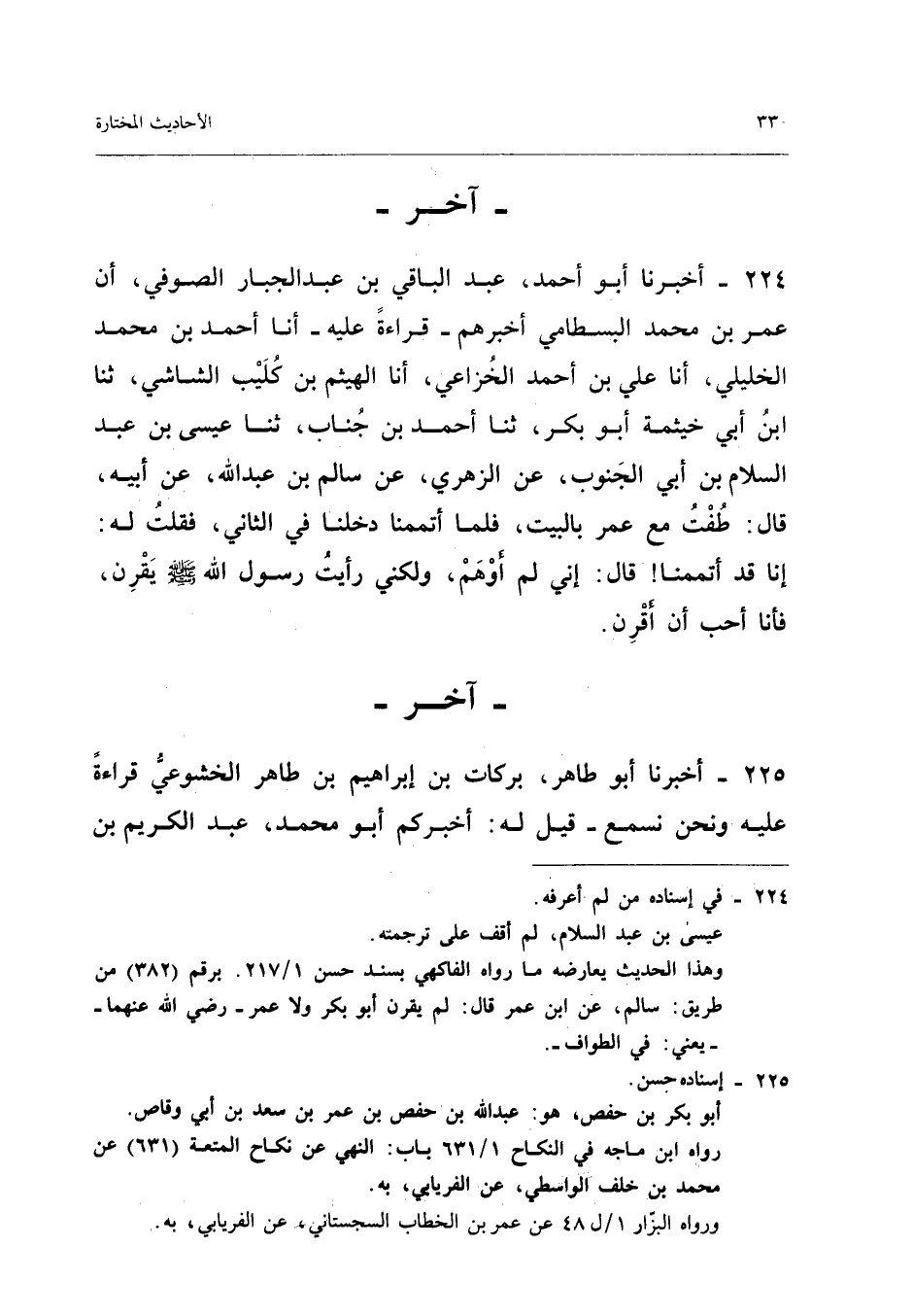 ٢٢٤ - أَخْبَرَنَا أَبُو أَحْمَدَ عَبْدُ الْبَاقِي بْنُ عَبْدِ الْجَبَّارِ الصُّوفِيُّ، أَنَّ عُمَرَ بْنَ مُحَمَّدٍ الْبِسْطَامِيَّ أَخْبَرَهُمْ - قِرَاءَةً عَلَيْهِ - أَنَا أَحْمَدُ بْنُ مُحَمَّدٍ الْخَلِيلِيُّ، أَنَا عَلِيُّ بْنُ أَحْمَدَ الْخُزَاعِيُّ، أَنَا الْهَيْثَمُ بْنُ كُلَيْبٍ الشَّاشِيُّ، ثَنَا ابْنُ أَبِي خَيْثَمَةَ أَبُو بَكْرٍ، ثَنَا أَحْمَدُ بْنُ جَنَابٍ، ثَنَا عِيسَى بْنُ (¬١) عَبْدِ السَّلَامِ بْنِ أَبِي الْجَنُوبِ، عَنِ الزُّهْرِيِّ، عَنْ سَالِمِ بْنِ عَبْدِ اللهِ عَنْ أَبِيهِ قَالَ: «طُفْتُ مَعَ عُمَرَ بِالْبَيْتِ، فَلَمَّا أَتْمَمْنَا دَخَلْنَا فِي الثَّانِي، فَقُلْتُ لَهُ: إِنَّا قَدْ أَتْمَمْنَا! قَالَ: إِنِّي لَمْ أَوْهَمْ وَلَكِنِّي رَأَيْتُ رَسُولَ اللهِ - صَلَّى اللهُ عَلَيْهِ وَسَلَّمَ - يَقْرِنُ فَأَنَا أُحِبُّ أَنْ أَقْرِنَ».