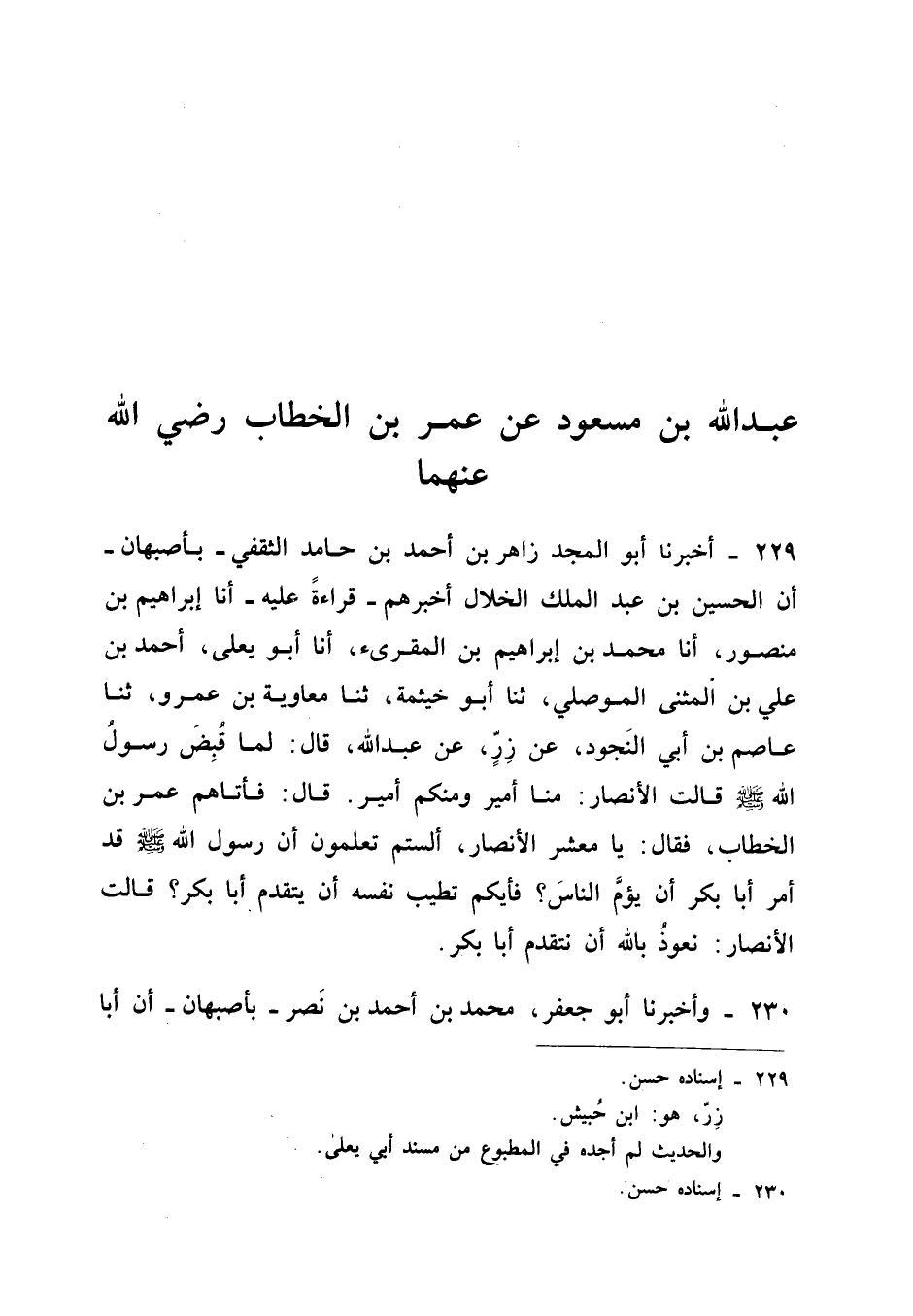 ٢٢٩ - أَخْبَرَنَا أَبُو الْمَجْدِ زَاهِرُ بْنُ أَحْمَدَ بْنِ حَامِدٍ الثَّقَفِيُّ - بِأَصْبَهَانَ - أَنَّ الْحُسَيْنَ بْنَ عَبْدِ الْمَلِكِ الْخَلَّالَ أَخْبَرَهُمْ - قِرَاءَةً عَلَيْهِ - أَنَا إِبْرَاهِيمُ بْنُ مَنْصُورٍ، أَنَا مُحَمَّدُ بْنُ إِبْرَاهِيمَ بْنِ الْمُقْرِئِ، أَنَا أَبُو يَعْلَى أَحْمَدُ بْنُ عَلِيِّ بْنِ الْمُثَنَّى الْمَوْصِلِيُّ، ثَنَا أَبُو خَيْثَمَةَ، ثَنَا مُعَاوِيَةُ بْنُ عَمْرٍو، ثَنَا عَاصِمُ بْنُ أَبِي النَّجُودِ، عَنْ زِرٍّ، عَنْ عَبْدِ اللهِ قَالَ «لَمَّا قُبِضَ رَسُولُ اللهِ - صَلَّى اللهُ عَلَيْهِ وَسَلَّمَ - قَالَتِ الْأَنْصَارُ مِنَّا أَمِيرٌ وَمِنْكُمْ أَمِيرٌ قَالَ: فَأَتَاهُمْ عُمَرُ بْنُ الْخَطَّابِ، فَقَالَ: يَا مَعْشَرَ الْأَنْصَارِ، أَلَسْتُمْ تَعْلَمُونَ أَنَّ رَسُولَ اللهِ - صَلَّى اللهُ عَلَيْهِ وَسَلَّمَ - قَدْ أَمَرَ أَبَا بَكْرٍ أَنْ يَؤُمَّ النَّاسَ؟ فَأَيُّكُمْ تَطِيبُ نَفْسُهُ أَنْ يَتَقَدَّمَ أَبَا بَكْرٍ؟ قَالَتِ الْأَنْصَارُ: نَعُوذُ بِاللهِ أَنْ نَتَقَدَّمَ أَبَا بَكْرٍ».