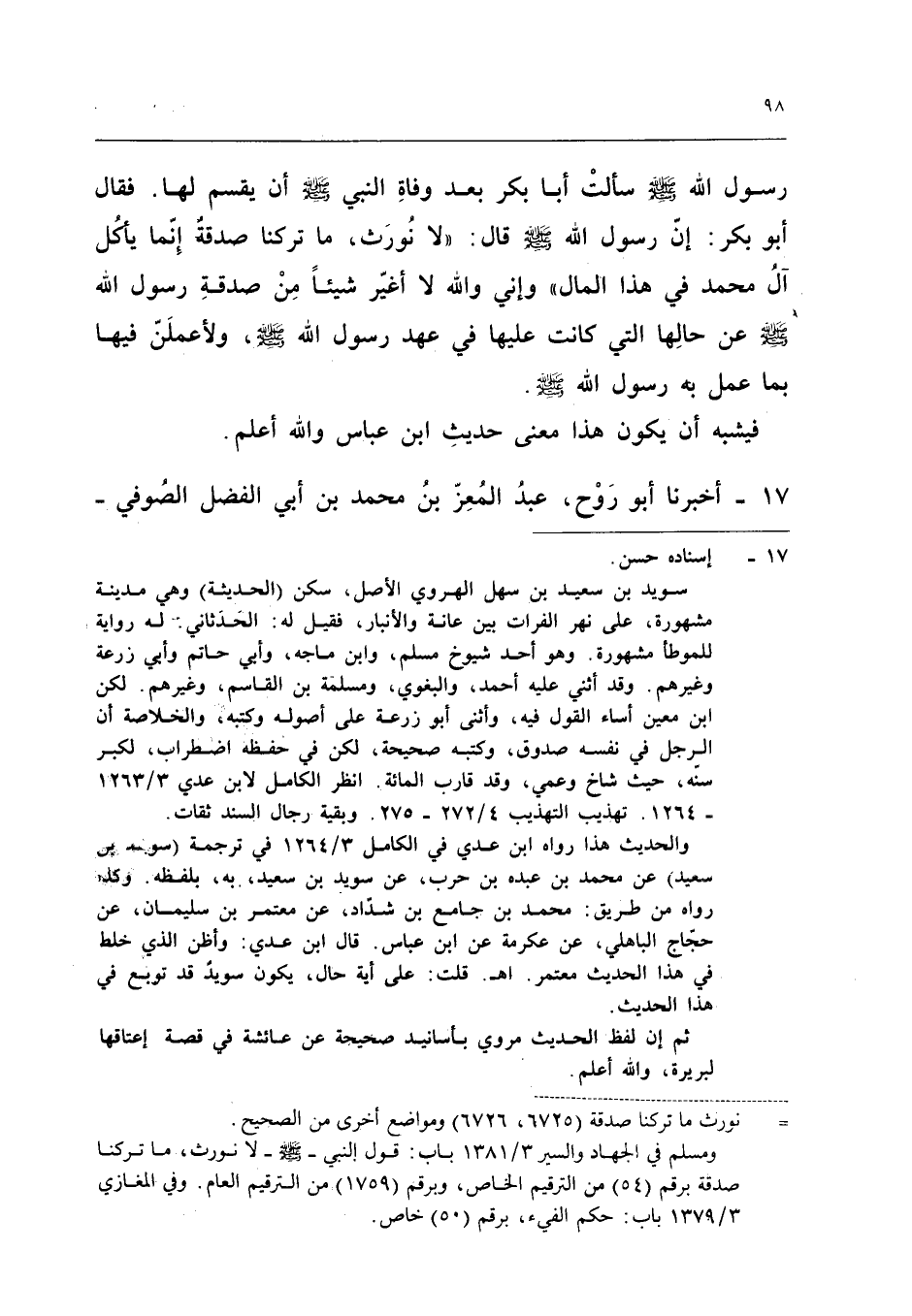 - بِهَرَاةَ - أَنَّ أَبَا الْقَاسِمِ تَمِيمَ بْنَ أَبِي سَعِيدِ بْنِ أَبِي الْعَبَّاسِ الْجُرْجَانِيَّ أَخْبَرَهُمْ - قِرَاءَةً عَلَيْهِ - أَنَا أَبُو سَعْدٍ مُحَمَّدُ بْنُ عَبْدِ الرَّحْمَنِ الْكَنْجَرُوذِيُّ، أَنَا أَبُو سَعِيدٍ مُحَمَّدُ بْنُ ثَوْرٍ الْعَبَّاسُ التَّمِيمِيُّ الْبَصْرِيُّ، أَنَا أَبُو لَبِيدٍ؛ مُحَمَّدُ بْنُ إِدْرِيسَ بْنِ إِيَاسٍ السَّامِيُّ السَّرَخْسِيُّ، ثَنَا سُوَيْدٌ هُوَ ابْنُ سَعِيدٍ، ثَنَا مُعْتَمِرُ بْنُ سُلَيْمَانَ عَنْ أَبِيهِ عَنْ عِكْرِمَةَ، عَنِ ابْنِ عَبَّاسٍ، عَنْ أَبِي بَكْرٍ الصِّدِّيقِ قَالَ: قَالَ رَسُولُ اللهِ - صَلَّى اللهُ عَلَيْهِ وَسَلَّمَ -: «الْوَلَاءُ لِمَنْ أَعْتَقَ».