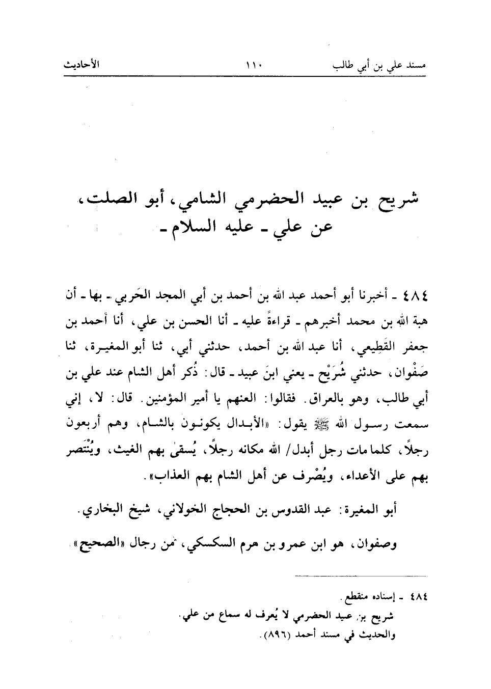 ٤٨٤ - أَخْبَرَنَا أَبُو أَحْمَدَ عَبْدُ اللهِ بْنُ أَحْمَدَ بْنِ أَبِي الْمَجْدِ الْحَرْبِيُّ (¬١) بِهَا، أَنَّ هِبَةَ اللهِ بْنَ مُحَمَّدٍ أَخْبَرَهُمْ - قِرَاءَةً عَلَيْهِ - أَنَا الْحَسَنُ بْنُ عَلِيٍّ، أَنَا أَحْمَدُ بْنُ جَعْفَرٍ الْقَطِيعِيُّ، أَنَا عَبْدُ اللهِ بْنُ أَحْمَدَ، حَدَّثَنِي أَبِي، ثَنَا أَبُو الْمُغِيرَةِ، ثَنَا صَفْوَانُ، حَدَّثَنِي شُرَيْحٌ - يَعْنِي ابْنَ عُبَيْدٍ - قَالَ: «ذُكِرَ أَهْلُ الشَّامِ عِنْدَ عَلِيِّ بْنِ أَبِي طَالِبٍ، وَهُوَ بِالْعِرَاقِ، فَقَالُوا: الْعَنْهُمْ يَا أَمِيرَ الْمُؤْمِنِينَ. قَالَ: لَا، إِنِّي سَمِعْتُ رَسُولَ اللهِ - صَلَّى اللهُ عَلَيْهِ وَسَلَّمَ - يَقُولُ: الْأَبْدَالُ يَكُونُونَ بِالشَّامِ، وَهُمْ أَرْبَعُونَ رَجُلًا، كُلَّمَا مَاتَ رَجُلٌ أَبْدَلَ اللهُ مَكَانَهُ رَجُلًا، يُسْقَى بِهِمُ الْغَيْثُ، وَيُنْتَصَرُ بِهِمْ عَلَى الْأَعْدَاءِ، وَيُصْرَفُ عَنْ أَهْلِ الشَّامِ بِهِمُ الْعَذَابُ».
