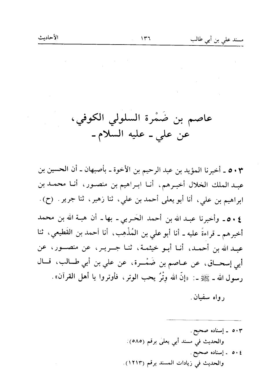 ٥٠٤ - وَأَخْبَرَنَا عَبْدُ اللهِ بْنُ أَحْمَدَ الْحَرْبِيُّ بِهَا، أَنَّ هِبَةَ اللهِ بْنَ مُحَمَّدٍ أَخْبَرَهُمْ - قِرَاءَةً عَلَيْهِ - أَنَا أَبُو عَلِيِّ بْنُ الْمُذْهِبِ، أَنَا أَحْمَدُ بْنُ الْقَطِيعِيِّ، ثَنَا عَبْدُ اللهِ بْنُ أَحْمَدَ، أَنَا أَبُو خَيْثَمَةَ، ثَنَا جَرِيرٌ، عَنْ مَنْصُورٍ، عَنْ أَبِي إِسْحَاقَ، عَنْ عَاصِمِ بْنِ ضَمْرَةَ، عَنْ عَلِيِّ بْنِ أَبِي طَالِبٍ، قَالَ رَسُولُ اللهِ -صَلَّى اللهُ عَلَيْهِ وَسَلَّمَ-: «إِنَّ اللهَ وِتْرٌ يُحِبُّ الْوِتْرَ، فَأَوْتِرُوا يَا أَهْلَ الْقُرْآنِ.» رَوَاهُ سُفْيَانُ.
