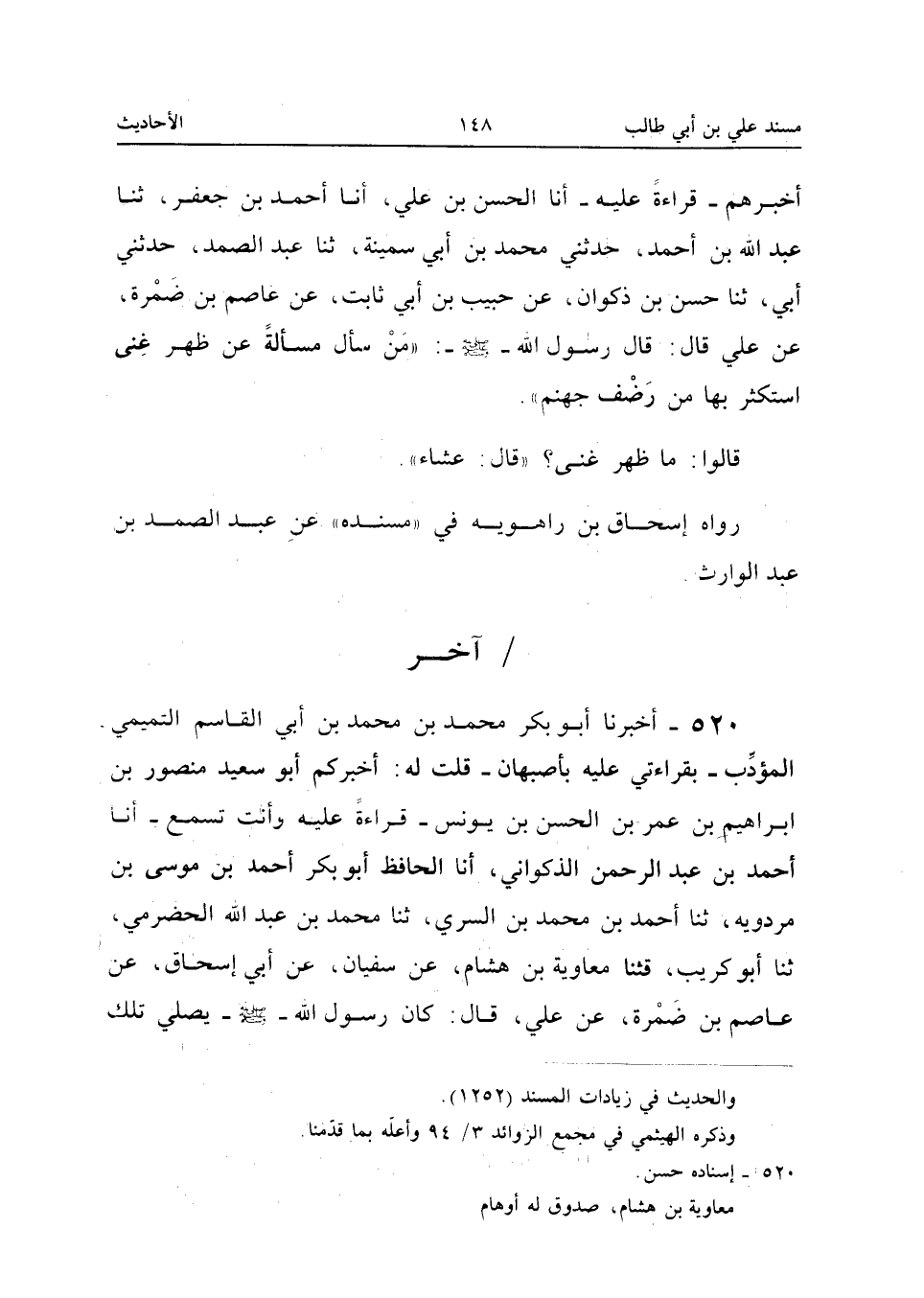 ٥٢٠ - أَخْبَرَنَا أَبُو بَكْرٍ مُحَمَّدُ بْنُ مُحَمَّدِ بْنِ أَبِي الْقَاسِمِ التَّمِيمِيُّ الْمُؤَدِّبُ - بِقِرَاءَتِي عَلَيْهِ بِأَصْبَهَانَ - قُلْتُ لَهُ: أَخْبَرَكُمْ أَبُو سَعِيدٍ مَنْصُورُ بْنُ إِبْرَاهِيمَ بْنِ عُمَرَ بْنِ الْحَسَنِ بْنِ يُونُسَ - قِرَاءَةً عَلَيْهِ وَأَنْتَ تَسْمَعُ - أَنَا أَحْمَدُ بْنُ عَبْدِ الرَّحْمَنِ الذَّكْوَانِيُّ، أَنَا الْحَافِظُ أَبُو بَكْرٍ أَحْمَدُ بْنُ مُوسَى بْنِ مَرْدُوَيْهِ، ثَنَا أَحْمَدُ بْنُ مُحَمَّدِ بْنِ السَّرِيِّ، ثَنَا مُحَمَّدُ بْنُ عَبْدِ اللهِ الْحَضْرَمِيُّ، ثَنَا أَبُو كُرَيْبٍ، قَثَنَا مُعَاوِيَةُ بْنُ هِشَامٍ، عَنْ سُفْيَانَ، عَنْ أَبِي إِسْحَاقَ، عَنْ عَاصِمِ بْنِ ضَمْرَةَ، عَنْ عَلِيٍّ قَالَ: «كَانَ رَسُولُ اللهِ - صَلَّى اللهُ عَلَيْهِ وَسَلَّمَ - يُصَلِّي تِلْكَ
