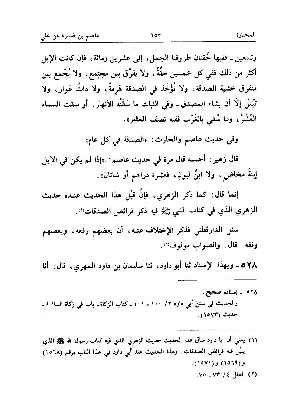 ابْنُ وَهْبٍ، أَخْبَرَنِي جَرِيرُ بْنُ حَازِمٍ وَسَمَّى آخَرَ، عَنْ أَبِي إِسْحَاقَ، عَنْ عَاصِمِ بْنِ ضَمْرَةَ، وَالْحَارِثِ الْأَعْوَرِ، عَنْ عَلِيٍّ -رَضِيَ اللهُ عَنْهُ - عَنِ النَّبِيِّ - صَلَّى اللهُ عَلَيْهِ وَسَلَّمَ - بِبَعْضٍ أَوَّلِ الْحَدِيثِ قَالَ: «فَإِذَا كَانَتْ لَكَ مِائَتَا دِرْهَمٍ وَحَالَ عَلَيْهَا الْحَوْلُ فَفِيهَا خَمْسَةُ دَرَاهِمَ، وَلَيْسَ عَلَيْكَ شَيْءٌ - يَعْنِي فِي الذَّهَبِ - حَتَّى يَكُونَ لَكَ عِشْرُونَ دِينَارًا، فَإِذَا كَانَتْ لَهُ عِشْرُونَ دِينَارًا، وَحَالَ عَلَيْهَا الْحَوْلُ فَفِيهَا نِصْفُ دِينَارٍ، فَمَا زَادَ فَبِحِسَابِ ذَلِكَ. قَالَ: فَلَا أَدْرِي أَعَلِيٌّ يَقُولُ: فَبِحِسَابِ ذَلِكَ، أَوْ رَفَعَهُ إِلَى النَّبِيِّ - صَلَّى اللهُ عَلَيْهِ وَسَلَّمَ -، وَلَيْسَ فِي مَالٍ زَكَاةٌ حَتَّى يَحُولَ عَلَيْهِ الْحَوْلُ». إِلَّا أَنَّ جَرِيرًا قَالَ: ابْنُ وَهْبٍ يَزِيدُ عَنِ النَّبِيِّ - صَلَّى اللهُ عَلَيْهِ وَسَلَّمَ - لَيْسَ فِي مَالٍ زَكَاةٌ حَتَّى يَحُولَ عَلَيْهِ الْحَوْلُ.
