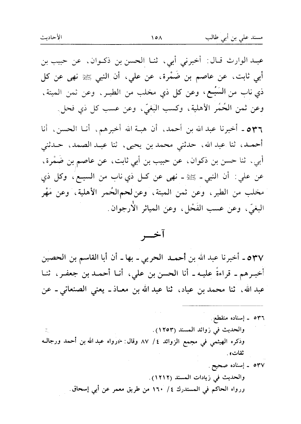 ٥٣٦ - أَخْبَرَنَا عَبْدُ اللهِ بْنُ أَحْمَدَ أَنَّ هِبَةَ اللهِ أَخْبَرَهُمْ، أَنَا الْحَسَنُ، أَنَا أَحْمَدُ، ثَنَا عَبْدُ اللهِ، حَدَّثَنِي مُحَمَّدُ بْنُ يَحْيَى، ثَنَا عَبْدُ الصَّمَدِ، حَدَّثَنِي أَبِي، ثَنَا حَسَنُ بْنُ ذَكْوَانَ، عَنْ حَبِيبِ بْنِ أَبِي ثَابِتٍ، عَنْ عَاصِمِ بْنِ ضَمْرَةَ، عَنْ عَلِيٍّ: أَنَّ النَّبِيَّ -صَلَّى اللهُ عَلَيْهِ وَسَلَّمَ - «نَهَى عَنْ كُلِّ ذِي نَابٍ مِنَ السَّبُعِ، وَكُلِّ ذِي مِخْلَبٍ مِنَ الطَّيْرِ، وَعَنْ ثَمَنِ الْمَيْتَةِ، وَعَنْ لَحْمِ الْحُمُرِ الْأَهْلِيَّةِ، وَعَنْ مَهْرِ الْبَغِيِّ، وَعَنْ عَسْبِ الْفَحْلِ، وَعَنِ الْمَيَاثِرِ الْأُرْجُوَانِ».