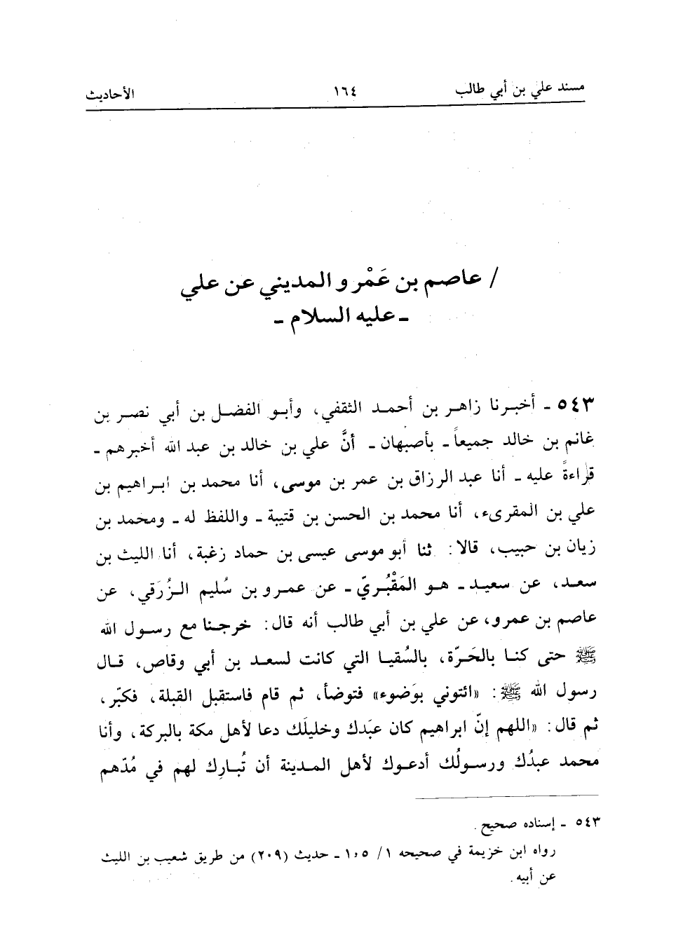 ٥٤٣ - أَخْبَرَنَا زَاهِرُ بْنُ أَحْمَدَ الثَّقَفِيُّ، وَأَبُو الْفَضْلِ بْنُ أَبِي نَصْرِ بْنِ غَانِمِ بْنِ خَالِدٍ جَمِيعًا - بِأَصْبَهَانَ - أَنَّ عَلِيَّ بْنَ خَالِدِ بْنِ عَبْدِ اللهِ أَخْبَرَهُمْ - قِرَاءَةً عَلَيْهِ - أَنَا عَبْدُ الرَّزَّاقِ بْنُ عُمَرَ بْنِ مُوسَى، أَنَا مُحَمَّدُ بْنُ إِبْرَاهِيمَ بْنِ عَلِيِّ بْنِ الْمُقْرِئِ، أَنَا مُحَمَّدُ بْنُ الْحَسَنِ بْنِ قُتَيْبَةَ - وَاللَّفْظُ لَهُ - وَمُحَمَّدُ بْنُ زَيَّانَ بْنِ حَبِيبٍ قَالَا: ثَنَا أَبُو مُوسَى عِيسَى بْنُ حَمَّادٍ زُغْبَةُ، أَنَا اللَّيْثُ بْنُ سَعْدٍ، عَنْ سَعِيدٍ - هُوَ الْمَقْبُرِيُّ - عَنْ عَمْرِو بْنِ سُلَيْمٍ الزُّرَقِيِّ، عَنْ عَاصِمِ بْنِ عَمْرٍو، عَنْ عَلِيِّ بْنِ أَبِي طَالِبٍ أَنَّهُ قَالَ: «خَرَجْنَا مَعَ رَسُولِ اللهِ -صَلَّى اللهُ عَلَيْهِ وَسَلَّمَ - حَتَّى كُنَّا بِالْحَرَّةِ بِالسُّقْيَا الَّتِي كَانَتْ لِسَعْدِ بْنِ أَبِي وَقَّاصٍ، قَالَ رَسُولُ اللهِ صَلَّى اللهُ عَلَيْهِ وَسَلَّمَ: ائْتُونِي بِوَضُوءٍ، فَتَوَضَّأَ، ثُمَّ قَامَ فَاسْتَقْبَلَ الْقِبْلَةَ فَكَبَّرَ، ثُمَّ قَالَ: اللَّهُمَّ إِنَّ إِبْرَاهِيمَ كَانَ عَبْدَكَ وَخَلِيلَكَ دَعَا لِأَهْلِ مَكَّةَ بِالْبَرَكَةِ، وَأَنَا مُحَمَّدٌ عَبْدُكَ وَرَسُولُكَ أَدْعُوكَ لِأَهْلِ الْمَدِينَةِ أَنْ تُبَارِكَ لَهُمْ فِي مُدِّهِمْ