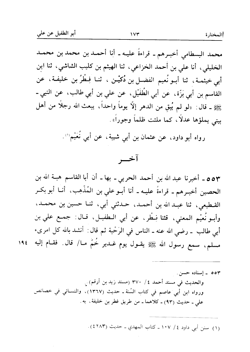 ٥٥٣ - أَخْبَرَنَا عَبْدُ اللهِ بْنُ أَحْمَدَ الْحَرْبِيُّ بِهَا، أَنَّ أَبَا الْقَاسِمِ هِبَةَ اللهِ بْنَ الْحُصَيْنِ أَخْبَرَهُمْ - قِرَاءَةً عَلَيْهِ - أَنَا أَبُو عَلِيِّ بْنُ الْمُذْهِبِ، أَنَا أَبُو بَكْرٍ الْقَطِيعِيُّ، ثَنَا عَبْدُ اللهِ بْنُ أَحْمَدَ، حَدَّثَنِي أَبِي، ثَنَا حُسَيْنُ بْنُ مُحَمَّدٍ، وَأَبُو نُعَيْمٍ الْمَعْنِيُّ، قَثَنَا فِطْرٌ، عَنْ أَبِي الطُّفَيْلِ قَالَ: «جَمَعَ عَلِيُّ بْنُ أَبِي طَالِبٍ -رَضِيَ اللهُ عَنْهُ - النَّاسَ فِي الرَّحَبَةِ، ثُمَّ قَالَ: أَنْشُدُ بِاللهِ كُلَّ امْرِئٍ مُسْلِمٍ سَمِعَ رَسُولَ اللهِ -صَلَّى اللهُ عَلَيْهِ وَسَلَّمَ - يَقُولُ يَوْمَ غَدِيرِ خُمٍّ مَا قَالَ. فَقَامَ إِلَيْهِ