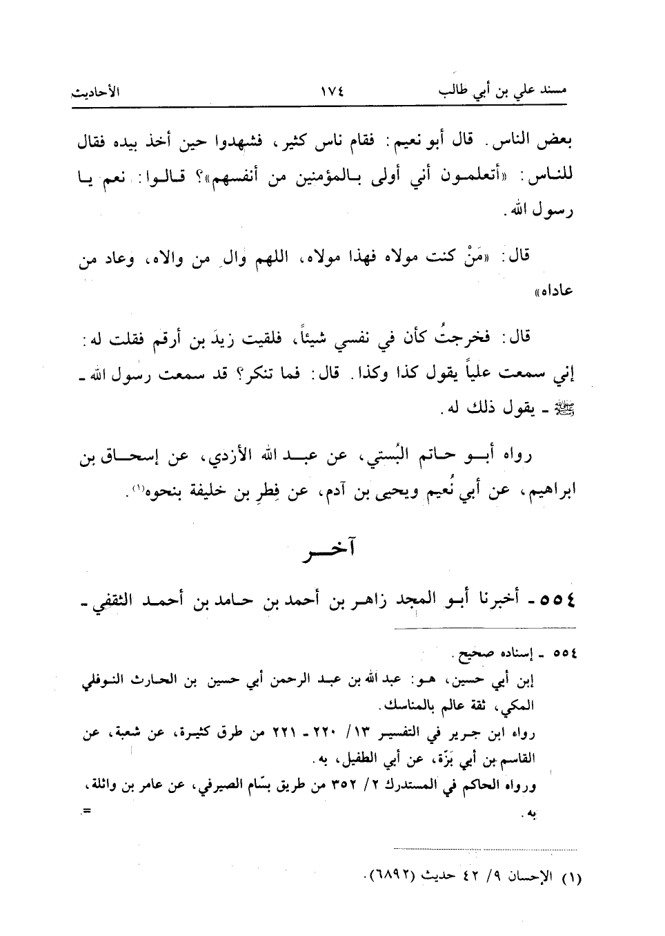 - بِقِرَاءَتِي عَلَيْهِ بِأَصْبَهَانَ - قُلْتُ لَهُ: أَخْبَرَكُمْ أَبُو عَبْدِ اللهِ الْحُسَيْنُ بْنُ عَبْدِ الْمَلِكِ بْنِ الْحُسَيْنِ الْخَلَّالُ - قِرَاءَةً عَلَيْهِ وَأَنْتَ تَسْمَعُ - أَنَا الْإِمَامُ أَبُو الْفَضْلِ عَبْدُ الرَّحْمَنِ بْنُ أَحْمَدَ بْنِ الْحَسَنِ بْنِ بُنْدَارٍ الرَّازِيُّ الْمُقْرِئُ، أَنَا أَبُو الْحَسَنِ أَحْمَدُ بْنُ إِبْرَاهِيمَ بْنِ أَحْمَدَ بْنِ عَلِيِّ بْنِ فِرَاسٍ، قَثَنَا أَبُو جَعْفَرٍ مُحَمَّدُ بْنُ إِبْرَاهِيمَ الدَّيْلِيُّ، ثَنَا أَبُو عُبَيْدِ اللهِ سَعِيدُ بْنُ عَبْدِ الرَّحْمَنِ الْمَخْزُومِيُّ، ثَنَا سُفْيَانُ بْنُ عُيَيْنَةَ، عَنِ ابْنِ أَبِي حُسَيْنٍ، عَنْ أَبِي الطُّفَيْلِ قَالَ: «سَمِعْتُ ابْنَ الْكَوَّاءِ سَأَلَ عَلِيًّا، وَهُوَ عَلَى الْمِنْبَرِ، عَنْ قَوْلِ اللهِ وَجَلَّ: {أَلَمْ تَرَ إِلَى الَّذِينَ بَدَّلُوا نِعْمَتَ اللهِ كُفْرًا وَأَحَلُّوا قَوْمَهُمْ دَارَ الْبَوَارِ} فَقَالَ: دَعْهُمْ عَنْكَ فَقَدْ كُفِيتَهُمْ؛ ذَلِكَ يَوْمُ بَدْرٍ.