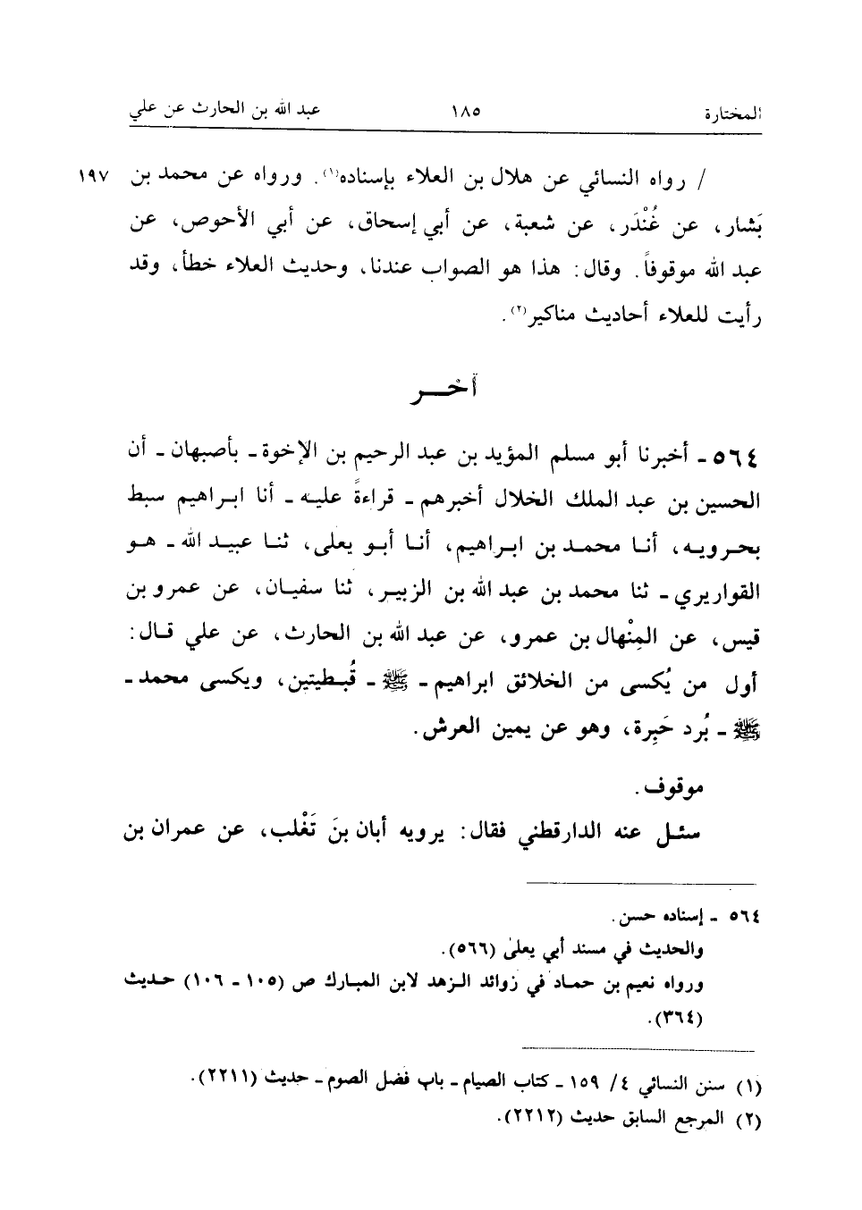 ٥٦٤ - أَخْبَرَنَا أَبُو مُسْلِمٍ الْمُؤَيَّدُ بْنُ عَبْدِ الرَّحِيمِ بْنِ الْإِخْوَةِ - بِأَصْبَهَانَ - أَنَّ الْحُسَيْنَ بْنَ عَبْدِ الْمَلِكِ الْخَلَّالَ أَخْبَرَهُمْ - قِرَاءَةً عَلَيْهِ - أَنَا إِبْرَاهِيمُ سِبْطُ بَحْرَوَيْهِ، أَنَا مُحَمَّدُ بْنُ إِبْرَاهِيمَ، أَنَا أَبُو يَعْلَى، ثَنَا عُبَيْدُ اللهِ -هُوَ الْقَوَارِيرِيُّ - ثَنَا مُحَمَّدُ بْنُ عَبْدِ اللهِ بْنِ الزُّبَيْرِ، ثَنَا سُفْيَانُ، عَنْ عَمْرِو بْنِ قَيْسٍ، عَنِ الْمِنْهَالِ بْنِ عَمْرٍو، عَنْ عَبْدِ اللهِ بْنِ الْحَارِثِ، عَنْ عَلِيٍّ قَالَ: «أَوَّلُ مَنْ يُكْسَى مِنَ الْخَلَائِقِ إِبْرَاهِيمُ -صَلَّى اللهُ عَلَيْهِ وَسَلَّمَ - قُبْطِيَّتَيْنِ، وَيُكْسَى مُحَمَّدٌ -صَلَّى اللهُ عَلَيْهِ وَسَلَّمَ - بُرْدَ حِبَرَةٍ، وَهُوَ عَنْ يَمِينِ الْعَرْشِ».