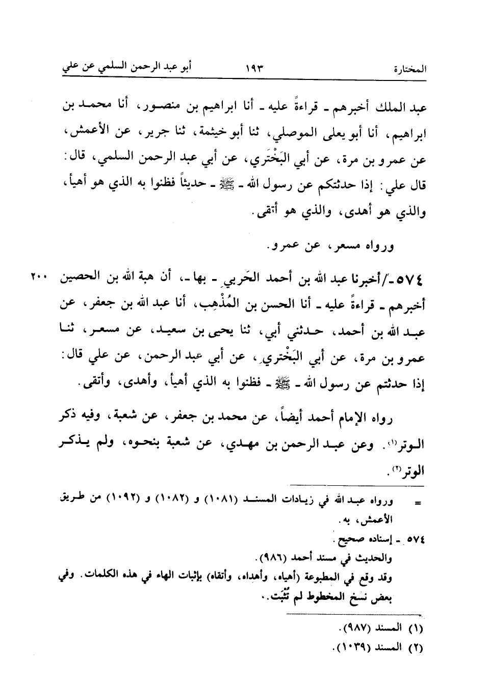 ٥٧٤ - أَخْبَرَنَا عَبْدُ اللهِ بْنُ أَحْمَدَ الْحَرْبِيُّ بِهَا، أَنَّ هِبَةَ اللهِ بْنَ الْحُصَيْنِ أَخْبَرَهُمْ - قِرَاءَةً عَلَيْهِ - أَنَا الْحَسَنُ بْنُ الْمُذْهِبِ، أَنَا عَبْدُ اللهِ بْنُ جَعْفَرٍ (¬١)، عَنْ عَبْدِ اللهِ بْنِ أَحْمَدَ، حَدَّثَنِي أَبِي، ثَنَا يَحْيَى بْنُ سَعِيدٍ، عَنْ مِسْعَرٍ، ثَنَا عَمْرُو بْنُ مُرَّةَ، عَنْ أَبِي الْبَخْتَرِيِّ، عَنْ أَبِي عَبْدِ الرَّحْمَنِ، عَنْ عَلِيٍّ قَالَ: «إِذَا حُدِّثْتُمْ عَنْ رَسُولِ اللهِ -صَلَّى اللهُ عَلَيْهِ وَسَلَّمَ - فَظُنُّوا بِهِ الَّذِي أَهْيَأُ وَأَهْدَى وَأَتْقَى».