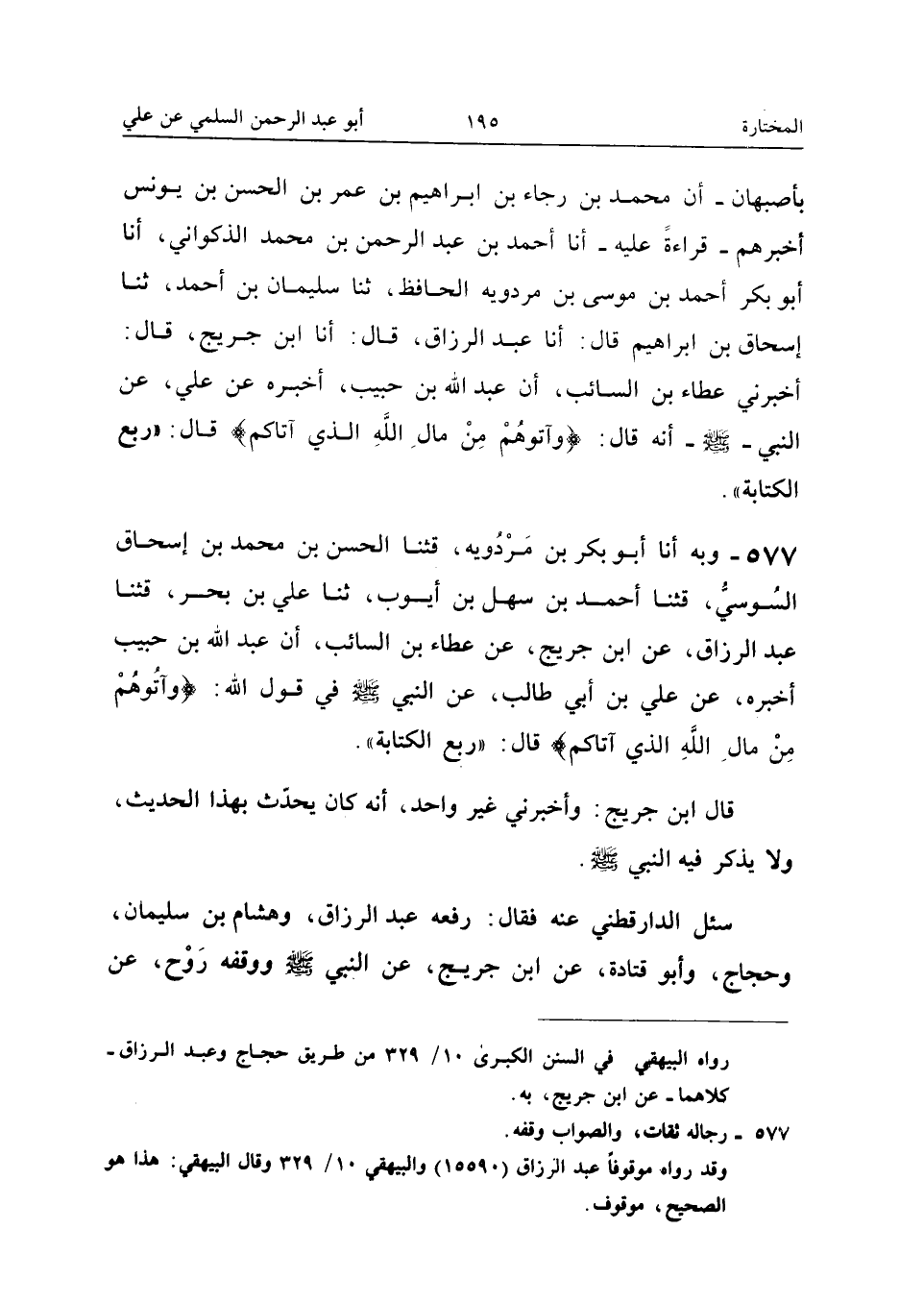 ٥٧٧ - وَبِهِ أَنَا أَبُو بَكْرِ بْنُ مَرْدُوَيْهِ، قَثَنَا الْحَسَنُ بْنُ مُحَمَّدِ بْنِ إِسْحَاقَ السُّوسِيُّ، قَثَنَا أَحْمَدُ بْنُ سَهْلِ بْنِ أَيُّوبَ، ثَنَا عَلِيُّ بْنُ بَحْرٍ، قَثَنَا عَبْدُ الرَّزَّاقِ، عَنِ ابْنِ جُرَيْجٍ، عَنْ عَطَاءِ بْنِ السَّائِبِ، أَنَّ عَبْدَ اللهِ بْنَ حَبِيبٍ أَخْبَرَهُ، عَنْ عَلِيِّ بْنِ أَبِي طَالِبٍ، عَنِ النَّبِيِّ -صَلَّى اللهُ عَلَيْهِ وَسَلَّمَ - «فِي قَوْلِ اللهِ: {وَآتُوهُمْ مِنْ مَالِ اللهِ الَّذِي آتَاكُمْ} قَالَ: رُبُعُ الْكِتَابَةِ».