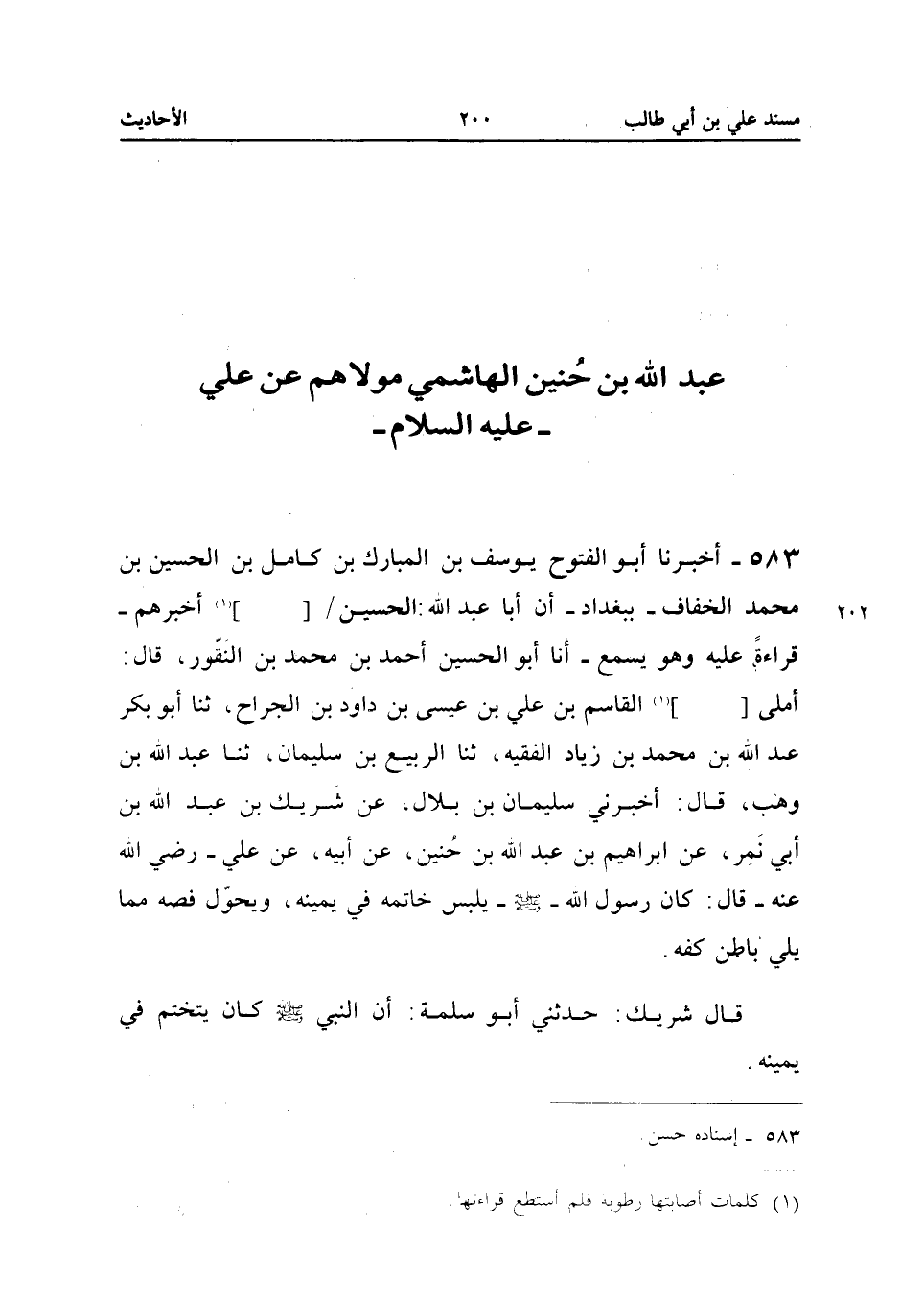 ٥٨٣ - أَخْبَرَنَا أَبُو الْفُتُوحِ يُوسُفُ بْنُ الْمُبَارَكِ بْنِ كَامِلِ بْنِ الْحُسَيْنِ بْنِ مُحَمَّدٍ الْخَفَّافُ - بِبَغْدَادَ - أَنَّ أَبَا عَبْدِ اللهِ الْحُسَيْنَ [ ... ] أَخْبَرَهُمْ - قِرَاءَةً عَلَيْهِ وَهُوَ يَسْمَعُ - أَنَا أَبُو الْحُسَيْنِ أَحْمَدُ بْنُ مُحَمَّدِ بْنِ النَّقُورِ قَالَ: أَمْلَى [ ... ] الْقَاسِمُ بْنُ عَلِيِّ بْنِ عِيسَى بْنِ دَاوُدَ بْنِ الْجَرَّاحِ (¬١)، ثَنَا أَبُو بَكْرٍ عَبْدُ اللهِ بْنُ مُحَمَّدِ بْنِ زِيَادٍ الْفَقِيهُ، ثَنَا الرَّبِيعُ بْنُ سُلَيْمَانَ، ثَنَا عَبْدُ اللهِ بْنُ وَهْبٍ قَالَ: أَخْبَرَنِي سُلَيْمَانُ بْنُ بِلَالٍ، عَنْ شَرِيكِ بْنِ عَبْدِ اللهِ بْنِ أَبِي نَمِرٍ، عَنْ إِبْرَاهِيمَ بْنِ عَبْدِ اللهِ بْنِ حُنَيْنٍ، عَنْ أَبِيهِ، عَنْ عَلِيٍّ -رَضِيَ اللهُ عَنْهُ - قَالَ: «كَانَ رَسُولُ اللهِ -صَلَّى اللهُ عَلَيْهِ وَسَلَّمَ - يَلْبَسُ خَاتَمَهُ فِي يَمِينِهِ، وَيُحَوِّلُ فَصَّهُ مِمَّا يَلِي بَاطِنَ كَفِّهِ».