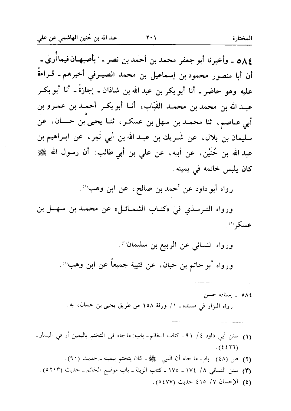 ٥٨٤ - وَأَخْبَرَنَا أَبُو جَعْفَرٍ مُحَمَّدُ بْنُ أَحْمَدَ بْنِ نَصْرٍ - بِأَصْبَهَانَ - فِيمَا أَرَى أَنَّ أَبَا مَنْصُورٍ مَحْمُودَ بْنَ إِسْمَاعِيلَ بْنِ مُحَمَّدٍ الصَّيْرَفِيَّ أَخْبَرَهُمْ - قِرَاءَةً عَلَيْهِ وَهُوَ حَاضِرٌ - أَنَا أَبُو بَكْرِ بْنُ عَبْدِ اللهِ بْنِ شَاذَانَ - إِجَازَةً - أَنَا أَبُو بَكْرٍ عَبْدُ اللهِ بْنُ مُحَمَّدِ بْنِ مُحَمَّدٍ الْقَبَّابُ، أَنَا أَبُو بَكْرٍ أَحْمَدُ بْنُ عَمْرِو بْنِ أَبِي عَاصِمٍ، ثَنَا مُحَمَّدُ بْنُ سَهْلِ بْنِ عَسْكَرٍ، ثَنَا يَحْيَى بْنُ حَسَّانَ، عَنْ سُلَيْمَانَ بْنِ بِلَالٍ، عَنْ شَرِيكِ بْنِ عَبْدِ اللهِ بْنِ أَبِي نَمِرٍ، عَنْ إِبْرَاهِيمَ بْنِ عَبْدِ اللهِ بْنِ حُنَيْنٍ، عَنْ أَبِيهِ، عَنْ عَلِيِّ بْنِ أَبِي طَالِبٍ: أَنَّ رَسُولَ اللهِ -صَلَّى اللهُ عَلَيْهِ وَسَلَّمَ - «كَانَ يَلْبَسُ خَاتَمَهُ فِي يَمِينِهِ».