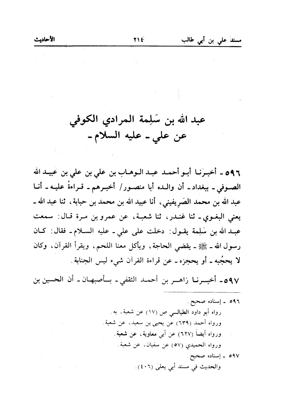 ٥٩٦ - أَخْبَرَنَا أَبُو أَحْمَدَ عَبْدُ الْوَهَّابِ بْنُ عَلِيِّ بْنِ عَلِيِّ بْنِ عُبَيْدِ اللهِ الصُّوفِيُّ - بِبَغْدَادَ - أَنَّ وَالِدَهُ أَبَا مَنْصُورٍ أَخْبَرَهُمْ - قِرَاءَةً عَلَيْهِ - أَنَا عَبْدُ اللهِ بْنُ مُحَمَّدٍ الصَّرِيفِينِيُّ، أَنَا عُبَيْدُ اللهِ بْنُ مُحَمَّدِ بْنِ حَبَابَةَ، ثَنَا عَبْدُ اللهِ -يَعْنِي الْبَغَوِيَّ - ثَنَا غُنْدَرٌ، ثَنَا شُعْبَةُ، عَنْ عَمْرِو بْنِ مُرَّةَ قَالَ: سَمِعْتُ عَبْدَ اللهِ بْنَ سَلِمَةَ يَقُولُ: دَخَلْتُ عَلَى عَلِيٍّ - عَلَيْهِ السَّلَامُ - فَقَالَ: «كَانَ رَسُولُ اللهِ -صَلَّى اللهُ عَلَيْهِ وَسَلَّمَ - يَقْضِي الْحَاجَةَ، وَيَأْكُلُ مَعَنَا اللَّحْمَ، وَيَقْرَأُ الْقُرْآنَ، وَكَانَ لَا يَحْجُبُهُ - أَوْ: يَحْجِزُهُ - عَنْ قِرَاءَةِ الْقُرْآنِ شَيْءٌ لَيْسَ الْجَنَابَةَ».