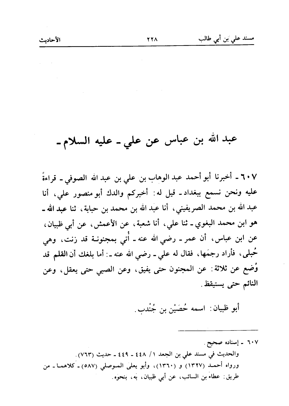 ٦٠٧ - أَخْبَرَنَا أَبُو أَحْمَدَ عَبْدُ الْوَهَّابِ بْنُ عَلِيِّ بْنِ عَبْدِ اللهِ الصُّوفِيُّ - قِرَاءَةً عَلَيْهِ وَنَحْنُ نَسْمَعُ بِبَغْدَادَ - قِيلَ لَهُ: أَخْبَرَكُمْ وَالِدُكَ أَبُو مَنْصُورٍ عَلِيٌّ، أَنَا عَبْدُ اللهِ بْنُ مُحَمَّدٍ الصَّرِيفِينِيُّ، أَنَا عَبْدُ اللهِ بْنُ مُحَمَّدِ بْنِ حَبَابَةَ (¬١)، ثَنَا عَبْدُ اللهِ - هُوَ ابْنُ مُحَمَّدٍ الْبَغَوِيُّ - ثَنَا عَلِيٌّ، أَنَا شُعْبَةُ، عَنِ الْأَعْمَشِ، عَنْ أَبِي ظِبْيَانَ، عَنِ ابْنِ عَبَّاسٍ، «أَنَّ عُمَرَ -رَضِيَ اللهُ عَنْهُ - أُتِيَ بِمَجْنُونَةٍ قَدْ زَنَتْ وَهِيَ حُبْلَى، فَأَرَادَ رَجْمَهَا، فَقَالَ لَهُ عَلِيٌّ رَضِيَ اللهُ عَنْهُ: أَمَا بَلَغَكَ أَنَّ الْقَلَمَ قَدْ وُضِعَ عَنْ ثَلَاثَةٍ: عَنِ الْمَجْنُونِ حَتَّى يُفِيقَ، وَعَنِ الصَّبِيِّ حَتَّى يَعْقِلَ، وَعَنِ النَّائِمِ حَتَّى يَسْتَيْقِظَ».