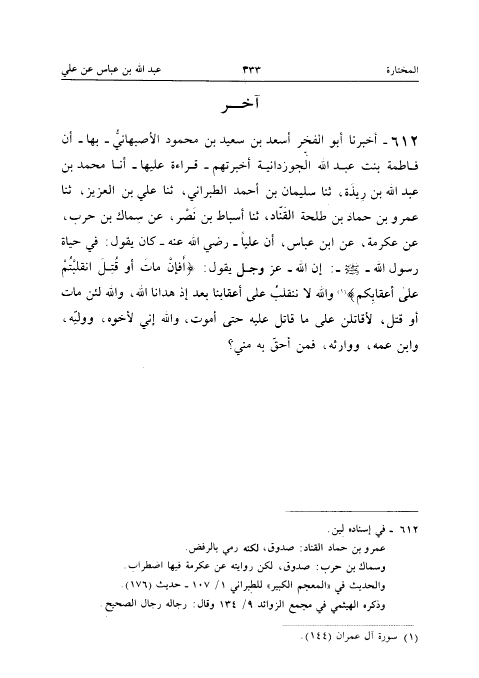 ٦١٢ - أَخْبَرَنَا أَبُو الْفَخْرِ أَسْعَدُ بْنُ سَعِيدِ بْنِ مَحْمُودٍ الْأَصْبَهَانِيُّ بِهَا، أَنَّ فَاطِمَةَ بِنْتَ عَبْدِ اللهِ الْجُوزْدَانِيَّةَ، أَخْبَرَتْهُمْ - قِرَاءَةً عَلَيْهَا - أَنَا مُحَمَّدُ بْنُ عَبْدِ اللهِ بْنِ رِيذَةَ، ثَنَا سُلَيْمَانُ بْنُ أَحْمَدَ الطَّبَرَانِيُّ، ثَنَا عَلِيُّ بْنُ الْعَزِيزِ، ثَنَا عَمْرُو بْنُ حَمَّادِ بْنِ طَلْحَةَ الْقَنَّادُ، ثَنَا أَسْبَاطُ بْنُ نَصْرٍ، عَنْ سِمَاكِ بْنِ حَرْبٍ، عَنْ عِكْرِمَةَ، عَنِ ابْنِ عَبَّاسٍ، «أَنَّ عَلِيًّا -رَضِيَ اللهُ عَنْهُ - كَانَ يَقُولُ فِي حَيَاةِ رَسُولِ اللهِ صَلَّى اللهُ عَلَيْهِ وَسَلَّمَ: إِنَّ اللهَ - عَزَّ وَجَلَّ - يَقُولُ: {أَفَإِنْ مَاتَ أَوْ قُتِلَ انْقَلَبْتُمْ عَلَى أَعْقَابِكُمْ} وَاللهِ لَا نَنْقَلِبُ عَلَى أَعْقَابِنَا بَعْدَ إِذْ هَدَانَا اللهُ، وَاللهِ لَئِنْ مَاتَ أَوْ قُتِلَ لَأُقَاتِلَنَّ عَلَى مَا قَاتَلَ عَلَيْهِ حَتَّى أَمُوتَ، وَاللهِ إِنِّي لَأَخُوهُ وَوَلِيُّهُ وَابْنُ عَمِّهِ وَوَارِثُهُ، فَمَنْ أَحَقُّ بِهِ مِنِّي.؟ »