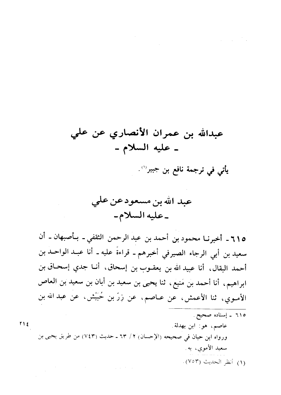 ٦١٥ - أَخْبَرَنَا مَحْمُودُ بْنُ أَحْمَدَ بْنِ عَبْدِ الرَّحْمَنِ الثَّقَفِيُّ - بِأَصْبَهَانَ - أَنَّ سَعِيدَ بْنَ أَبِي الرَّجَاءِ الصَّيْرَفِيَّ أَخْبَرَهُمْ - قِرَاءَةً عَلَيْهِ - أَنَا عَبْدُ الْوَاحِدِ بْنُ أَحْمَدَ الْبَقَّالُ، أَنَا عُبَيْدُ اللهِ بْنُ يَعْقُوبَ بْنِ إِسْحَاقَ، أَنَا جَدِّي إِسْحَاقُ بْنُ إِبْرَاهِيمَ، أَنَا أَحْمَدُ بْنُ مَنِيعٍ، ثَنَا يَحْيَى بْنُ سَعِيدِ بْنِ أَبَانَ بْنِ سَعِيدِ بْنِ الْعَاصِ الْأُمَوِيُّ، ثَنَا الْأَعْمَشُ، عَنْ عَاصِمٍ، عَنْ زِرِّ بْنِ حُبَيْشٍ، عَنْ عَبْدِ اللهِ بْنِ