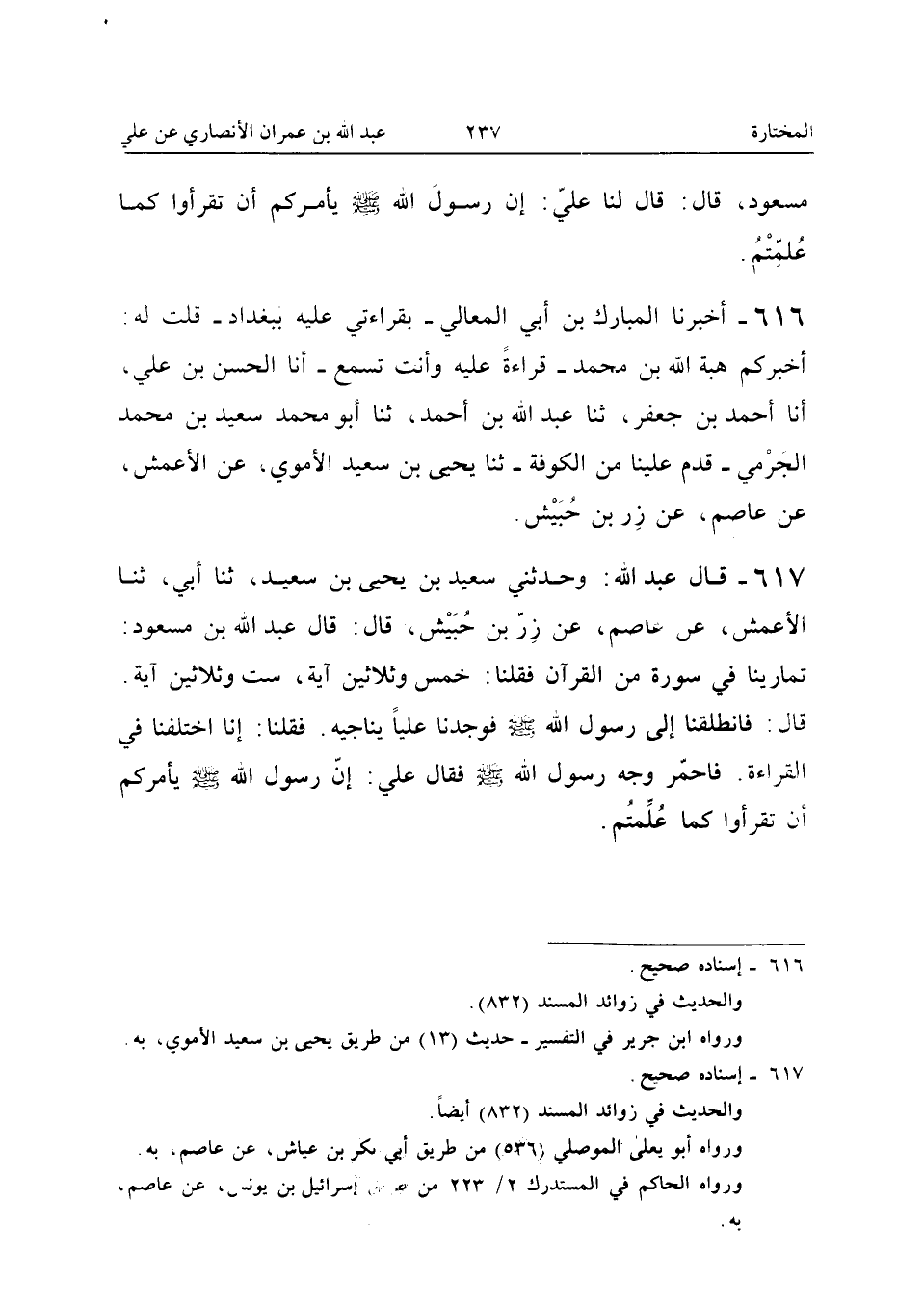 ٦١٦ - أَخْبَرَنَا الْمُبَارَكُ بْنُ أَبِي الْمَعَالِي - بِقِرَاءَتِي عَلَيْهِ بِبَغْدَادَ - قُلْتُ لَهُ: أَخْبَرَكُمْ هِبَةُ اللهِ بْنُ مُحَمَّدٍ - قِرَاءَةً عَلَيْهِ وَأَنْتَ تَسْمَعُ - أَنَا الْحَسَنُ بْنُ عَلِيٍّ، أَنَا أَحْمَدُ بْنُ جَعْفَرٍ، ثَنَا عَبْدُ اللهِ بْنُ أَحْمَدَ، ثَنَا أَبُو مُحَمَّدٍ سَعِيدُ بْنُ مُحَمَّدٍ الْجَرْمِيُّ - قَدِمَ عَلَيْنَا مِنَ الْكُوفَةِ - ثَنَا يَحْيَى بْنُ سَعِيدٍ الْأُمَوِيُّ، عَنِ الْأَعْمَشِ، عَنْ عَاصِمٍ، عَنْ زِرِّ بْنِ حُبَيْشٍ.