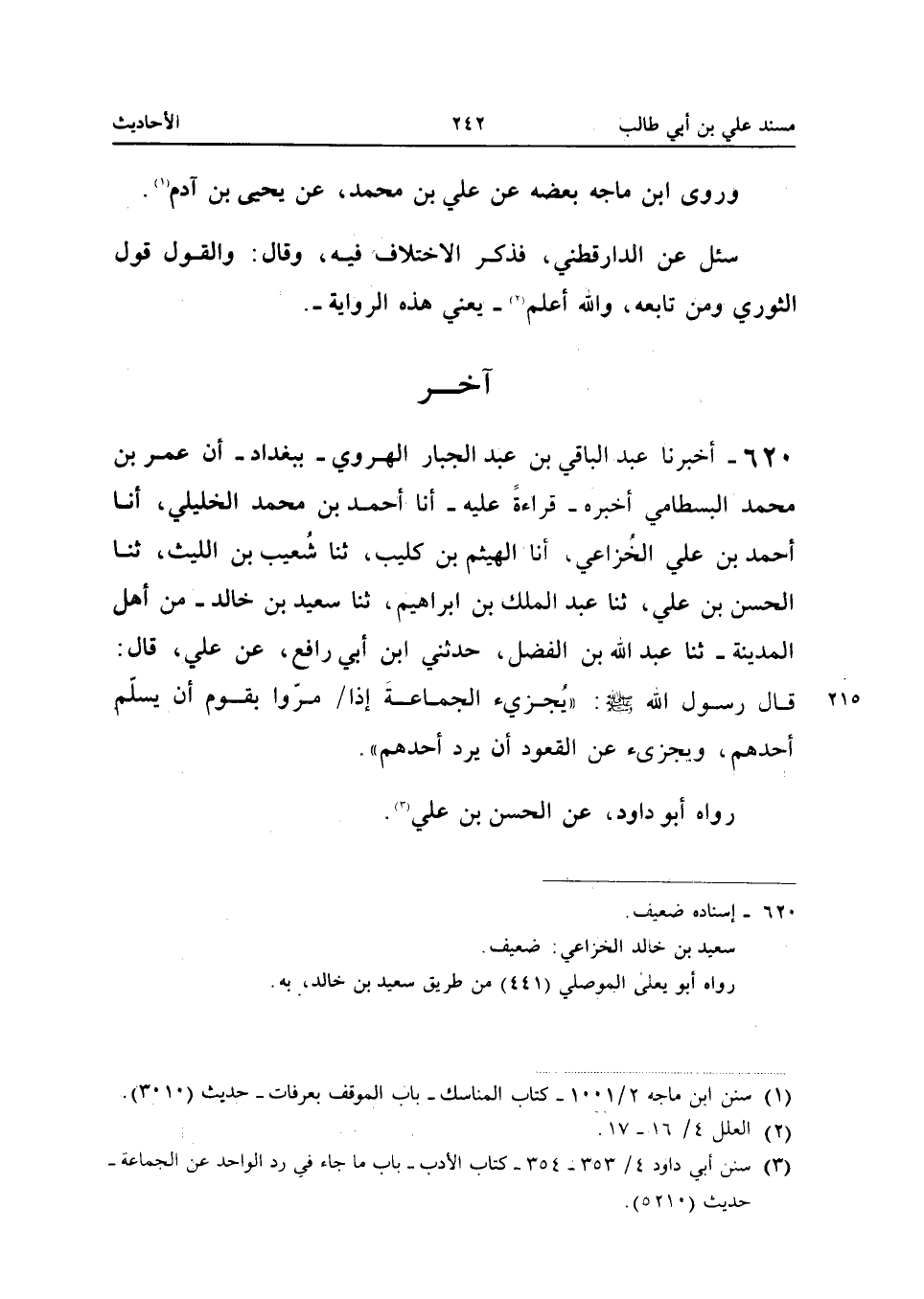 ٦٢٠ - أَخْبَرَنَا عَبْدُ الْبَاقِي بْنُ عَبْدِ الْجَبَّارِ الْهَرَوِيُّ - بِبَغْدَادَ - أَنَّ عُمَرَ بْنَ مُحَمَّدٍ الْبِسْطَامِيَّ، أَخْبَرَهُ - قِرَاءَةً عَلَيْهِ - أَنَا أَحْمَدُ بْنُ مُحَمَّدٍ الْخَلِيلِيُّ، أَنَا أَحْمَدُ بْنُ عَلِيٍّ الْخُزَاعِيُّ، أَنَا الْهَيْثَمُ بْنُ كُلَيْبٍ، ثَنَا شُعَيْبُ بْنُ اللَّيْثِ، ثَنَا الْحَسَنُ بْنُ عَلِيٍّ، ثَنَا عَبْدُ الْمَلِكِ بْنُ إِبْرَاهِيمَ، ثَنَا سَعِيدُ بْنُ خَالِدٍ مِنْ أَهْلِ الْمَدِينَةِ - ثَنَا عَبْدُ اللهِ بْنُ الْفَضْلِ، حَدَّثَنِي ابْنُ أَبِي رَافِعٍ، عَنْ عَلِيٍّ قَالَ: قَالَ رَسُولُ اللهِ -صَلَّى اللهُ عَلَيْهِ وَسَلَّمَ-: «يُجْزِئُ الْجَمَاعَةَ إِذَا مَرُّوا بِقَوْمٍ أَنْ يُسَلِّمَ أَحَدُهُمْ، وَيُجْزِئُ عَنِ الْقُعُودِ أَنْ يَرُدَّ أَحَدُهُمْ».