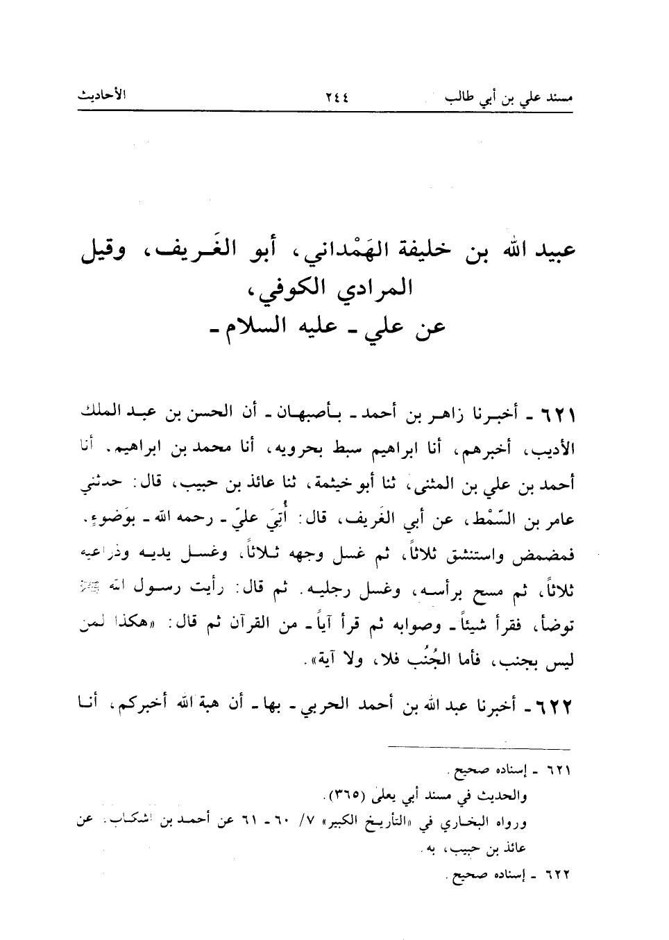 ٦٢١ - أَخْبَرَنَا زَاهِرُ بْنُ أَحْمَدَ - بِأَصْبَهَانَ - أَنَّ الْحَسَنَ بْنَ عَبْدِ الْمَلِكِ الْأَدِيبَ (¬١) أَخْبَرَهُمْ، أَنَا إِبْرَاهِيمُ سِبْطُ بَحْرَوَيْهِ، أَنَا مُحَمَّدُ بْنُ إِبْرَاهِيمَ، أَنَا أَحْمَدُ بْنُ عَلِيِّ بْنِ الْمُثَنَّى، ثَنَا أَبُو خَيْثَمَةَ، ثَنَا عَائِذُ بْنُ حَبِيبٍ قَالَ: حَدَّثَنِي عَامِرُ بْنُ السِّمْطِ، عَنْ أَبِي الْغَرِيفِ قَالَ: «أُتِيَ عَلِيٌّ - رَحِمَهُ اللهُ - بِوَضُوءٍ فَمَضْمَضَ وَاسْتَنْشَقَ ثَلَاثًا، ثُمَّ غَسَلَ وَجْهَهُ ثَلَاثًا، وَغَسَلَ يَدَيْهِ وَذِرَاعَيْهِ ثَلَاثًا، ثُمَّ مَسَحَ بِرَأْسِهِ وَغَسَلَ رِجْلَيْهِ، ثُمَّ قَالَ: رَأَيْتُ رَسُولَ اللهِ - صَلَّى اللهُ عَلَيْهِ وَسَلَّمَ - تَوَضَّأَ فَقَرَأَ شَيْئًا - وَصَوَابُهُ: ثُمَّ قَرَأَ آيًا - مِنَ الْقُرْآنِ، ثُمَّ قَالَ: هَكَذَا لِمَنْ لَيْسَ بِجُنُبٍ، فَأَمَّا الْجُنُبُ فَلَا، وَلَا آيَةَ».