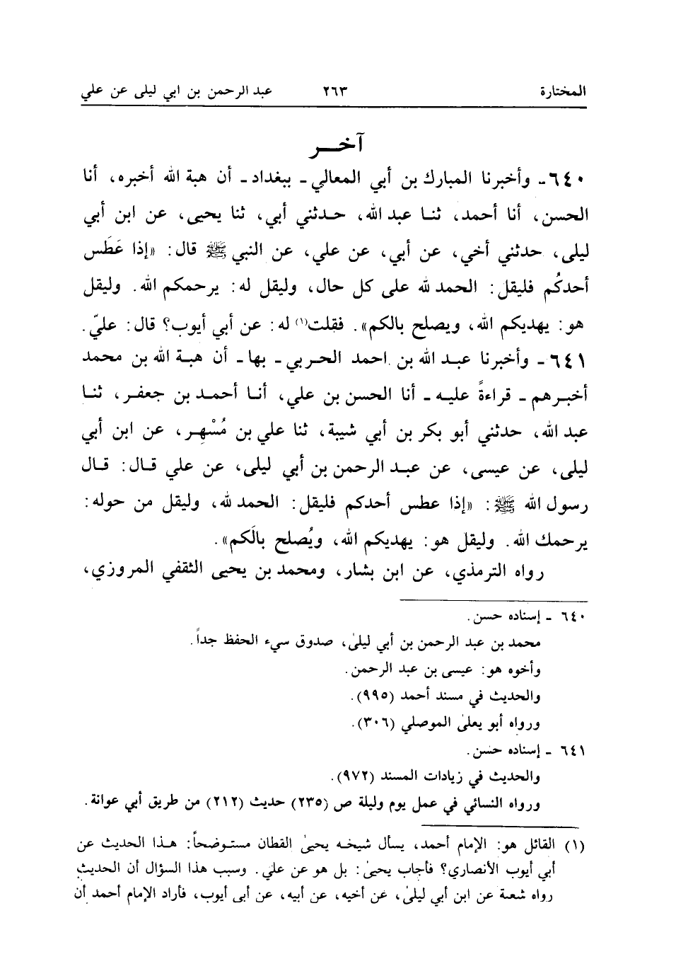 ٦٤٠ - وَأَخْبَرَنَا الْمُبَارَكُ بْنُ أَبِي الْمَعَالِي - بِبَغْدَادَ - أَنَّ هِبَةَ اللهِ أَخْبَرَهُ، أَنَا الْحَسَنُ، أَنَا أَحْمَدُ، ثَنَا عَبْدُ اللهِ، حَدَّثَنِي أَبِي، ثَنَا يَحْيَى، عَنِ ابْنِ أَبِي لَيْلَى، حَدَّثَنِي أَخِي، عَنْ أَبِي، عَنْ عَلِيٍّ، عَنِ النَّبِيِّ -صَلَّى اللهُ عَلَيْهِ وَسَلَّمَ - قَالَ: «إِذَا عَطَسَ أَحَدُكُمْ فَلْيَقُلِ: الْحَمْدُ لِلهِ عَلَى كُلِّ حَالٍ، وَلْيُقَلْ لَهُ: يَرْحَمُكُمُ اللهُ. وَلْيُقَلْ هُوَ: يَهْدِيكُمُ اللهُ وَيُصْلِحُ بَالَكُمْ.» فَقُلْتُ لَهُ: عَنْ أَبِي أَيُّوبَ؟ قَالَ: عَلِيٍّ.