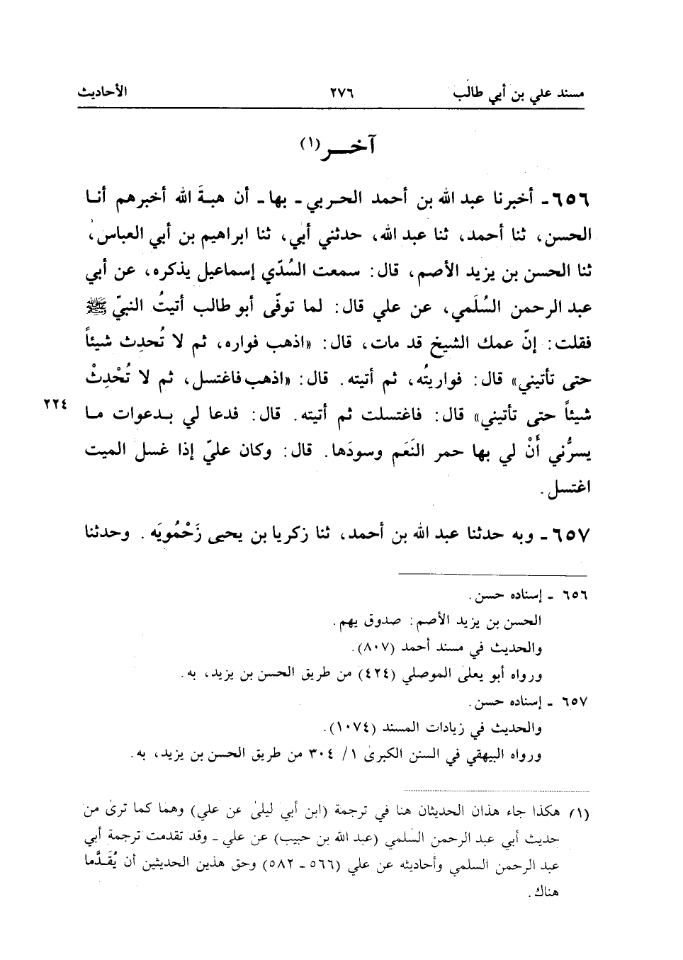 ٦٥٦ - أَخْبَرَنَا عَبْدُ اللهِ بْنُ أَحْمَدَ الْحَرْبِيُّ بِهَا، أَنَّ هِبَةَ اللهِ أَخْبَرَهُمْ، أَنَا الْحَسَنُ، ثَنَا أَحْمَدُ، ثَنَا عَبْدُ اللهِ، حَدَّثَنِي أَبِي، ثَنَا إِبْرَاهِيمُ بْنُ أَبِي الْعَبَّاسِ، ثَنَا الْحَسَنُ بْنُ يَزِيدَ الْأَصَمُّ قَالَ: سَمِعْتُ السُّدِّيَّ إِسْمَاعِيلَ يَذْكُرُهُ، عَنْ أَبِي عَبْدِ الرَّحْمَنِ السُّلَمِيِّ، عَنْ عَلِيٍّ قَالَ: «لَمَّا تُوُفِّيَ أَبُو طَالِبٍ أَتَيْتُ النَّبِيَّ -صَلَّى اللهُ عَلَيْهِ وَسَلَّمَ - فَقُلْتُ: إِنَّ عَمَّكَ الشَّيْخَ قَدْ مَاتَ، قَالَ: اذْهَبْ فَوَارِهِ، ثُمَّ لَا تُحْدِثْ شَيْئًا حَتَّى تَأْتِيَنِي. قَالَ: فَوَارَيْتُهُ، ثُمَّ أَتَيْتُهُ. قَالَ: اذْهَبْ فَاغْتَسِلْ، ثُمَّ لَا تُحْدِثْ شَيْئًا حَتَّى تَأْتِيَنِي. قَالَ: فَاغْتَسَلْتُ ثُمَّ أَتَيْتُهُ، قَالَ: فَدَعَا لِي بِدَعَوَاتٍ مَا يَسُرُّنِي أَنَّ لِي بِهَا حُمْرَ النَّعَمِ وَسُودَهَا. قَالَ: وَكَانَ عَلِيٌّ إِذَا غَسَّلَ الْمَيِّتَ اغْتَسَلَ».