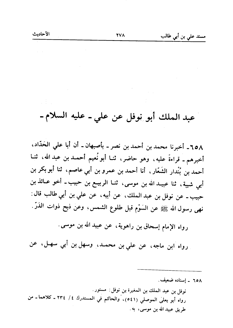 ٦٥٨ - أَخْبَرَنَا مُحَمَّدُ بْنُ أَحْمَدَ بْنِ نَصْرٍ - بِأَصْبَهَانَ - أَنَّ أَبَا عَلِيٍّ الْحَدَّادَ، أَخْبَرَهُمْ - قِرَاءَةً عَلَيْهِ وَهُوَ حَاضِرٌ - ثَنَا أَبُو نُعَيْمٍ أَحْمَدُ بْنُ عَبْدِ اللهِ، ثَنَا أَحْمَدُ بْنُ بُنْدَارٍ الشَّعَّارُ، أَنَا أَحْمَدُ بْنُ عَمْرِو بْنِ أَبِي عَاصِمٍ، ثَنَا أَبُو بَكْرِ بْنُ أَبِي شَيْبَةَ، ثَنَا عُبَيْدُ اللهِ بْنُ مُوسَى، ثَنَا الرَّبِيعُ بْنُ حَبِيبٍ - أَخُو عَائِذِ بْنِ حَبِيبٍ - عَنْ نَوْفَلِ بْنِ عَبْدِ الْمَلِكِ، عَنْ أَبِيهِ، عَنْ عَلِيِّ بْنِ أَبِي طَالِبٍ قَالَ: «نَهَى رَسُولُ اللهِ -صَلَّى اللهُ عَلَيْهِ وَسَلَّمَ - عَنِ السَّوْمِ قَبْلَ طُلُوعِ الشَّمْسِ، وَعَنْ ذَبْحِ ذَوَاتِ الدَّرِّ».