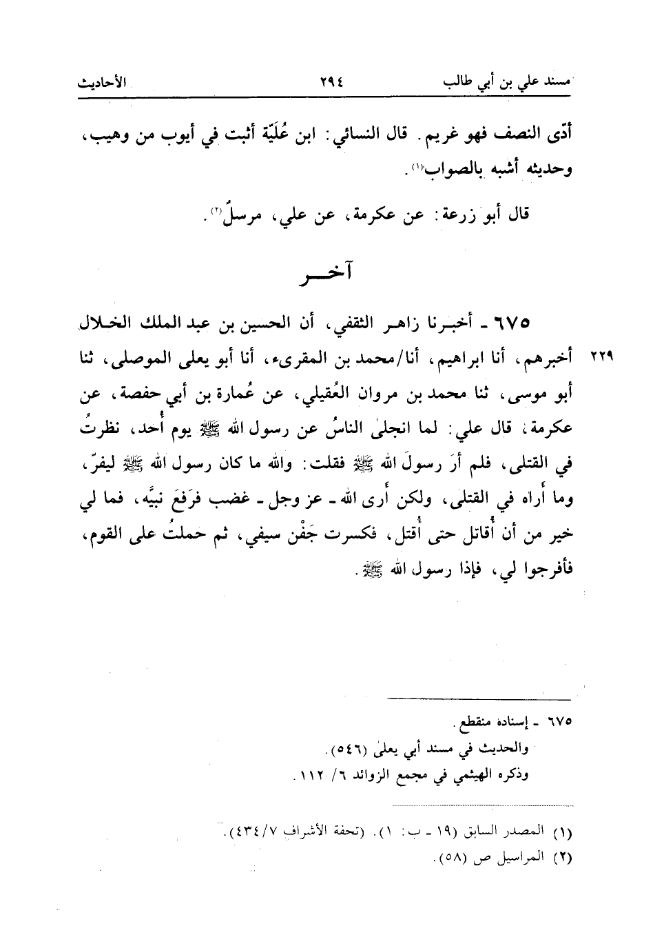 ٦٧٥ - أَخْبَرَنَا زَاهِرٌ الثَّقَفِيُّ، أَنَّ الْحُسَيْنَ بْنَ عَبْدِ الْمَلِكِ الْخَلَّالَ أَخْبَرَهُمْ، أَنَا إِبْرَاهِيمُ، أَنَا مُحَمَّدُ بْنُ الْمُقْرِئِ، أَنَا أَبُو يَعْلَى الْمَوْصِلِيُّ، ثَنَا أَبُو مُوسَى، ثَنَا مُحَمَّدُ بْنُ مَرْوَانَ الْعُقَيْلِيُّ، عَنْ عُمَارَةَ بْنِ أَبِي حَفْصَةَ، عَنْ عِكْرِمَةَ، قَالَ عَلِيٌّ: «لَمَّا انْجَلَى النَّاسُ عَنْ رَسُولِ اللهِ -صَلَّى اللهُ عَلَيْهِ وَسَلَّمَ - يَوْمَ أُحُدٍ نَظَرْتُ فِي الْقَتْلَى، فَلَمْ أَرَ رَسُولَ اللهِ -صَلَّى اللهُ عَلَيْهِ وَسَلَّمَ - فَقُلْتُ: وَاللهِ مَا كَانَ رَسُولُ اللهِ -صَلَّى اللهُ عَلَيْهِ وَسَلَّمَ - لِيَفِرَّ، وَمَا أَرَاهُ فِي الْقَتْلَى، وَلَكِنْ أَرَى اللهَ -عَزَّ وَجَلَّ - غَضِبَ فَرَفَعَ نَبِيَّهُ، فَمَا لِي خَيْرٌ مِنْ أَنْ أُقَاتِلَ حَتَّى أُقْتَلَ، فَكَسَرْتُ جَفْنَ سَيْفِي، ثُمَّ حَمَلْتُ عَلَى الْقَوْمِ، فَأَفْرَجُوا لِي، فَإِذَا رَسُولُ اللهِ صَلَّى اللهُ عَلَيْهِ وَسَلَّمَ».