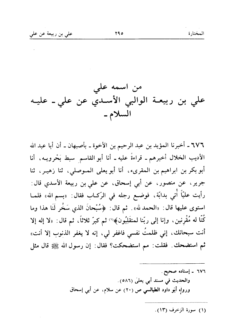 ٦٧٦ - أَخْبَرَنَا الْمُؤَيَّدُ بْنُ عَبْدِ الرَّحِيمِ بْنِ الْإِخْوَةِ - بِأَصْبَهَانَ - أَنَّ أَبَا عَبْدِ اللهِ الْأَدِيبَ الْخَلَّالَ أَخْبَرَهُمْ - قِرَاءَةً عَلَيْهِ - أَنَا أَبُو الْقَاسِمِ سِبْطُ بَحْرَوَيْهِ، أَنَا أَبُو بَكْرِ بْنُ إِبْرَاهِيمَ بْنِ الْمُقْرِئِ، أَنَا أَبُو يَعْلَى الْمَوْصِلِيُّ، ثَنَا زُهَيْرٌ، ثَنَا جَرِيرٌ، عَنْ مَنْصُورٍ، عَنْ أَبِي إِسْحَاقَ، عَنْ عَلِيِّ بْنِ رَبِيعَةَ الْأَسَدِيِّ، قَالَ: «رَأَيْتُ عَلِيًّا أُتِيَ بِدَابَّةٍ فَوَضَعَ رِجْلَهُ فِي الرِّكَابِ، فَقَالَ: بِسْمِ اللهِ فَلَمَّا اسْتَوَى عَلَيْهَا قَالَ: الْحَمْدُ لِلهِ، ثُمَّ قَالَ: {سُبْحَانَ الَّذِي سَخَّرَ لَنَا هَذَا وَمَا كُنَّا لَهُ مُقْرِنِينَ * وَإِنَّا إِلَى رَبِّنَا لَمُنْقَلِبُونَ} ثُمَّ كَبَّرَ ثَلَاثًا، ثُمَّ قَالَ: لَا إِلَهَ إِلَّا أَنْتَ سُبْحَانَكَ إِنِّي ظَلَمْتُ نَفْسِي فَاغْفِرْ لِي إِنَّهُ لَا يَغْفِرُ الذُّنُوبَ إِلَّا أَنْتَ. ثُمَّ اسْتَضْحَكَ. فَقُلْتُ: مِمَّ اسْتَضْحَكْتَ؟ فَقَالَ: إِنَّ رَسُولَ اللهِ -صَلَّى اللهُ عَلَيْهِ وَسَلَّمَ - قَالَ مِثْلَ