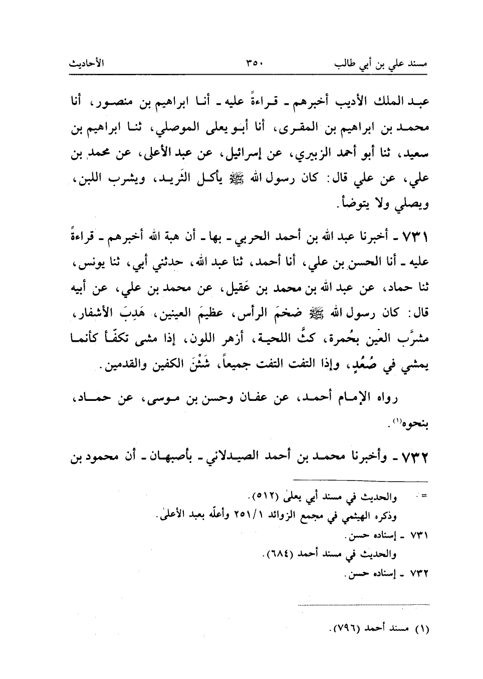 ٧٣١ - أَخْبَرَنَا عَبْدُ اللهِ بْنُ أَحْمَدَ الْحَرْبِيُّ بِهَا، أَنَّ هِبَةَ اللهِ أَخْبَرَهُمْ - قِرَاءَةً عَلَيْهِ - أَنَا الْحَسَنُ بْنُ عَلِيٍّ، أَنَا أَحْمَدُ، ثَنَا عَبْدُ اللهِ، حَدَّثَنِي أَبِي، ثَنَا يُونُسُ، ثَنَا حَمَّادٌ، عَنْ عَبْدِ اللهِ بْنِ مُحَمَّدِ بْنِ عَقِيلٍ، عَنْ مُحَمَّدِ بْنِ عَلِيٍّ، عَنْ أَبِيهِ قَالَ: «كَانَ رَسُولُ اللهِ -صَلَّى اللهُ عَلَيْهِ وَسَلَّمَ - ضَخْمَ الرَّأْسِ، عَظِيمَ الْعَيْنَيْنِ هَدِبَ الْأَشْفَارِ، مُشْرَبَ الْعَيْنِ بِحُمْرَةٍ، كَثَّ اللِّحْيَةِ، أَزْهَرَ اللَّوْنِ إِذَا مَشَى تَكَفَّأَ كَأَنَّمَا يَمْشِي فِي صُعُدٍ، وَإِذَا الْتَفَتَ الْتَفَتَ جَمِيعًا، شَثْنَ الْكَفَّيْنِ وَالْقَدَمَيْنِ».