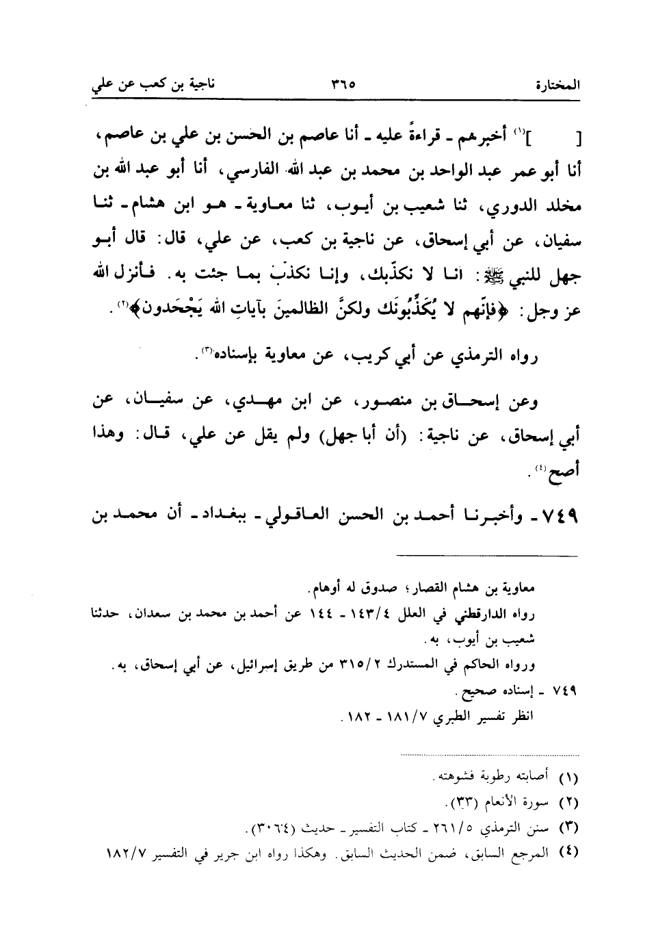 عَبْدِ الْمَلِكِ بْنِ الْحَسَنِ بْنِ خَيْرُونَ أَخْبَرَهُمْ - قِرَاءَةً عَلَيْهِ - أَنَا أَبُو جَعْفَرِ بْنُ الْمُسْلِمَةِ، أَنَا عِيسَى بْنُ عَلِيٍّ، ثَنَا عَبْدُ اللهِ الْبَغَوِيُّ، ثَنَا مُحَمَّدُ بْنُ مَنْصُورٍ الطُّوسِيُّ، ثَنَا أَبُو أَحْمَدَ، ثَنَا إِسْرَائِيلُ، عَنْ أَبِي إِسْحَاقَ، عَنْ نَاجِيَةَ، عَنْ عَلِيٍّ: أَنَّهُ «كَانَ يَقْرَأُ هَذَا الْحَرْفَ: {فَإِنَّهُمْ لا يُكَذِّبُونَكَ} مُخَفَّفَةً».