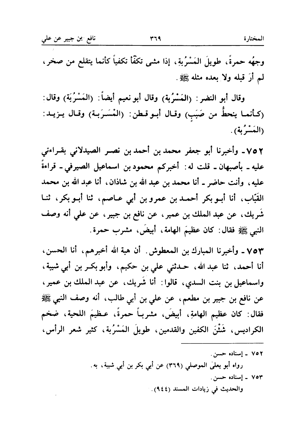 ٧٥٣ - وَأَخْبَرَنَا الْمُبَارَكُ بْنُ الْمَعْطُوشِ: أَنَّ هِبَةَ اللهِ أَخْبَرَهُمْ، أَنَا الْحَسَنُ، أَنَا أَحْمَدُ، ثَنَا عَبْدُ اللهِ، حَدَّثَنِي عَلِيُّ بْنُ حَكِيمٍ، وَأَبُو بَكْرِ بْنُ أَبِي شَيْبَةَ وَإِسْمَاعِيلُ ابْنُ بِنْتِ السُّدِّيِّ، قَالُوا: أَنَا شَرِيكٌ، عَنْ عَبْدِ الْمَلِكِ بْنِ عُمَيْرٍ، عَنْ نَافِعِ بْنِ جُبَيْرِ بْنِ مُطْعِمٍ، عَنْ عَلِيِّ بْنِ أَبِي طَالِبٍ، أَنَّهُ وَصَفَ النَّبِيَّ -صَلَّى اللهُ عَلَيْهِ وَسَلَّمَ - فَقَالَ: «كَانَ عَظِيمَ الْهَامَةِ، أَبْيَضَ، مُشْرَبًا حُمْرَةً، عَظِيمَ اللِّحْيَةِ، ضَخْمَ الْكَرَادِيسِ، شَثْنَ الْكَفَّيْنِ وَالْقَدَمَيْنِ، طَوِيلَ الْمَسْرُبَةِ، كَثِيرَ شَعَرِ الرَّأْسِ،