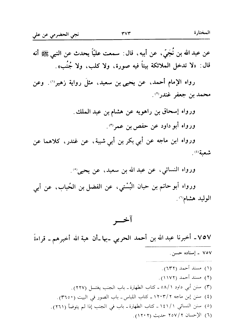 عَلَيْهِ - أَنَا الْحَسَنُ، أَنَا أَحْمَدُ، ثَنَا عَبْدُ اللهِ، حَدَّثَنِي أَبِي، ثَنَا مُحَمَّدُ بْنُ عُبَيْدٍ، ثَنَا شُرَحْبِيلُ بْنُ مُدْرِكٍ الْجُعْفِيُّ، عَنْ عَبْدِ اللهِ بْنِ نُجَيٍّ الْحَضْرَمِيِّ، عَنْ أَبِيهِ قَالَ: قَالَ عَلِيٌّ: «كَانَتْ لِي مِنْ رَسُولِ اللهِ - صَلَّى اللهُ عَلَيْهِ وَسَلَّمَ - مَنْزِلَةٌ لَمْ تَكُنْ لِأَحَدٍ مِنَ الْخَلَائِقِ، إِنِّي كُنْتُ آتِيهِ كُلَّ سَحَرٍ فَأُسَلِّمُ عَلَيْهِ حَتَّى يَتَنَحْنَحَ، وَإِنِّي جِئْتُ ذَاتَ لَيْلَةٍ فَسَلَّمْتُ عَلَيْهِ فَقُلْتُ: السَّلَامُ عَلَيْكَ يَا نَبِيَّ اللهِ. فَقَالَ: عَلَى رِسْلِكَ يَا أَبَا حَسَنٍ حَتَّى أَخْرُجَ إِلَيْكَ، فَلَمَّا خَرَجَ إِلَيَّ قُلْتُ: يَا نَبِيَّ اللهِ أَغْضَبَكَ أَحَدٌ؟ قَالَ: لَا، قُلْتُ: فَمَا لَكَ لَمْ تُكَلِّمْنِي فِيمَا مَضَى حَتَّى كَلَّمْتَنِي اللَّيْلَةَ؟ قَالَ: إِنِّي سَمِعْتُ فِي الْحُجْرَةِ حَرَكَةً فَقُلْتُ: مَنْ هَذَا؟ فَقَالَ: أَنَا جِبْرِيلُ، قُلْتُ: ادْخُلْ، قَالَ: لَا، اخْرُجْ إِلَيَّ. فَلَمَّا خَرَجْتُ قَالَ: إِنَّ فِي بَيْتِكَ شَيْئًا لَا يَدْخُلُهُ مَلَكٌ مَا دَامَ فِيهِ، قُلْتُ: مَا أَعْلَمُهُ يَا جِبْرِيلُ، قَالَ: اذْهَبْ فَانْظُرْ، فَفَتَحْتُ الْبَيْتَ فَلَمْ أَجِدْ فِيهِ شَيْئًا غَيْرَ جَرْوٍ كَانَ يَلْعَبُ بِهِ الْحَسَنُ. قُلْتُ: مَا وَجَدْتُ إِلَّا جَرْوًا، قَالَ: إِنَّهَا ثَلَاثٌ، لَنْ يَلِجَ مَلَكٌ مَا دَامَ فِيهَا أَبَدًا وَاحِدٌ مِنْهَا: كَلْبٌ أَوْ جَنَابَةٌ أَوْ صُورَةُ رُوحٍ».