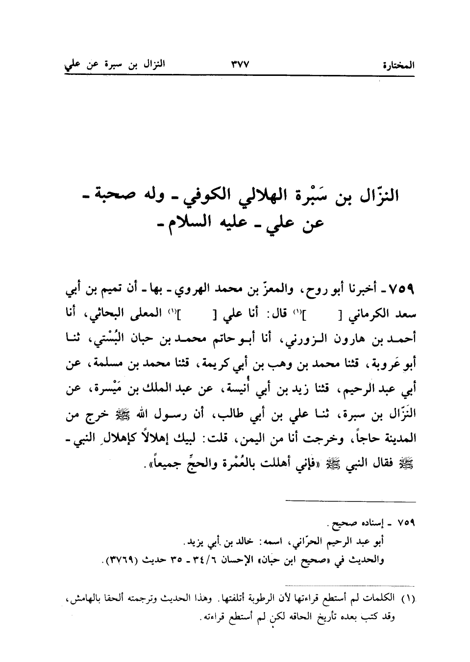 ٧٥٩ - أَخْبَرَنَا أَبُو رَوْحٍ [عَبْدِ] (¬١) الْمُعِزِّ بْنُ مُحَمَّدٍ الْهَرَوِيُّ بِهَا، أَنَّ تَمِيمَ بْنَ أَبِي سَعْدٍ الْكَرْمَانِيَّ (¬٢) [ ... ] قَالَ: أَنَا عَلِيٌّ [ ... ] (¬٣) الْمُعَلَّى الْبَحَّاثِيُّ، أَنَا أَحْمَدُ بْنُ هَارُونَ الزَّوْرَنِيُّ (¬٤)، أَنَا أَبُو حَاتِمٍ مُحَمَّدُ بْنُ حَبَّانَ الْبُسْتِيُّ، ثَنَا أَبُو عَرُوبَةَ، قَثَنَا مُحَمَّدُ بْنُ وَهْبِ بْنِ أَبِي كَرِيمَةَ، قَثَنَا مُحَمَّدُ بْنُ مَسْلَمَةَ (¬٥)، عَنْ أَبِي عَبْدِ الرَّحِيمِ، قَثَنَا زَيْدُ بْنُ أَبِي أُنَيْسَةَ، عَنْ عَبْدِ الْمَلِكِ بْنِ مَيْسَرَةَ، عَنِ النَّزَّالِ بْنِ سَبْرَةَ، ثَنَا عَلِيُّ بْنُ أَبِي طَالِبٍ، «أَنَّ رَسُولَ اللهِ -صَلَّى اللهُ عَلَيْهِ وَسَلَّمَ - خَرَجَ مِنَ الْمَدِينَةِ حَاجًّا، وَخَرَجْتُ أَنَا مِنَ الْيَمَنِ، قُلْتُ: لَبَّيْكَ إِهْلَالًا كَإِهْلَالِ النَّبِيِّ -صَلَّى اللهُ عَلَيْهِ وَسَلَّمَ - فَقَالَ النَّبِيُّ - صَلَّى اللهُ عَلَيْهِ وَسَلَّمَ -: فَإِنِّي أَهْلَلْتُ بِالْعُمْرَةِ وَالْحَجِّ جَمِيعًا».