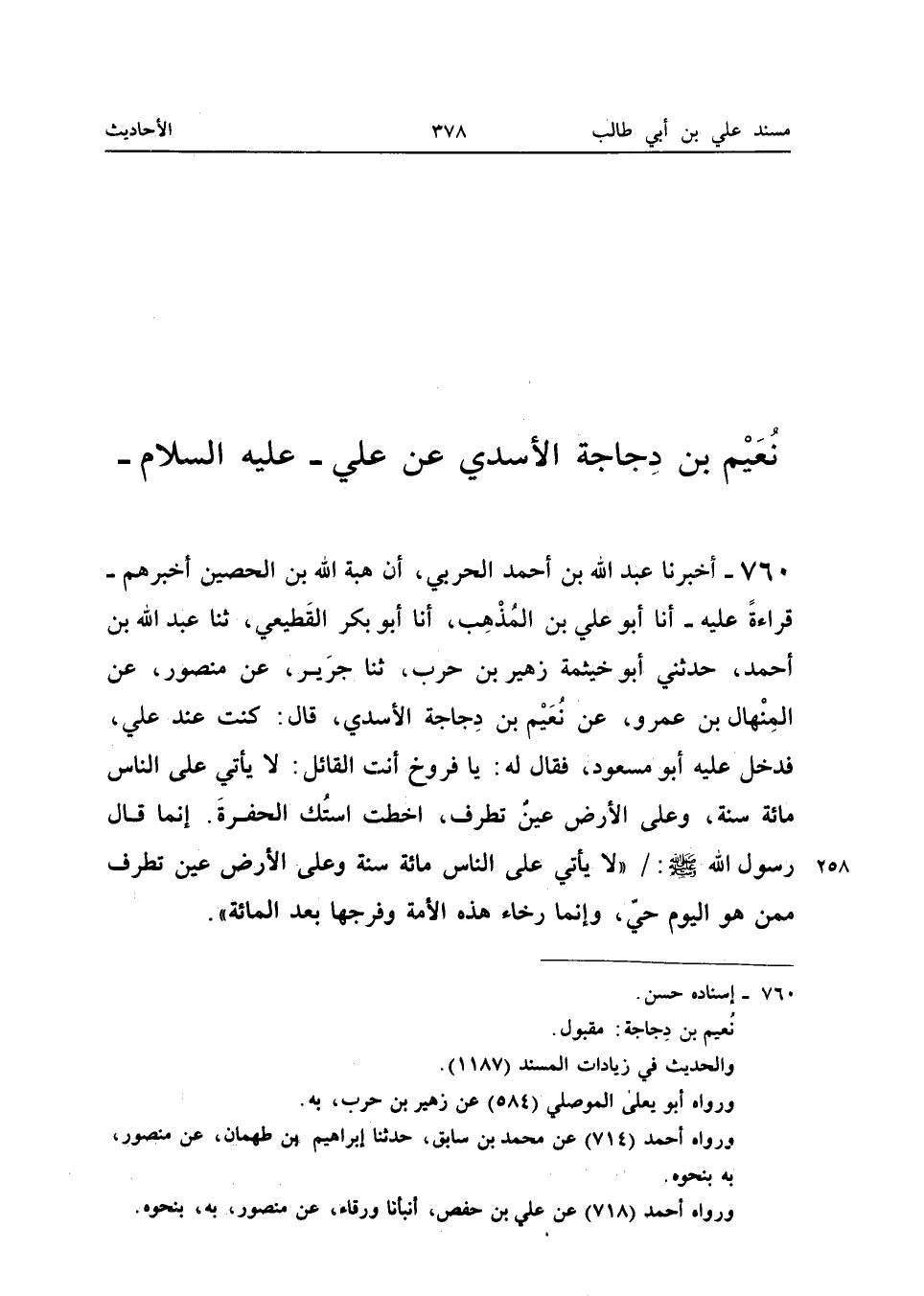 ٧٦٠ - أَخْبَرَنَا عَبْدُ اللهِ بْنُ أَحْمَدَ الْحَرْبِيُّ، أَنَّ هِبَةَ اللهِ بْنَ الْحُصَيْنِ أَخْبَرَهُمْ - قِرَاءَةً عَلَيْهِ - أَنَا أَبُو عَلِيِّ بْنُ الْمُذْهِبِ، أَنَا أَبُو بَكْرٍ الْقَطِيعِيُّ، ثَنَا عَبْدُ اللهِ بْنُ أَحْمَدَ، حَدَّثَنِي أَبُو خَيْثَمَةَ زُهَيْرُ بْنُ حَرْبٍ، ثَنَا جَرِيرٌ، عَنْ مَنْصُورٍ، عَنِ الْمِنْهَالِ بْنِ عَمْرٍو، عَنْ نُعَيْمِ بْنِ دَجَاجَةَ الْأَسَدِيِّ قَالَ: «كُنْتُ عِنْدَ عَلِيٍّ، فَدَخَلَ عَلَيْهِ أَبُو مَسْعُودٍ، فَقَالَ لَهُ: يَا فَرُّوخُ أَنْتَ الْقَائِلُ: لَا يَأْتِي عَلَى النَّاسِ مِائَةُ سَنَةٍ وَعَلَى الْأَرْضِ عَيْنٌ تَطْرِفُ؟ أَخْطَتِ اسْتُكَ الْحُفْرَةَ، إِنَّمَا قَالَ رَسُولُ اللهِ صَلَّى اللهُ عَلَيْهِ وَسَلَّمَ: لَا يَأْتِي عَلَى النَّاسِ مِائَةُ سَنَةٍ وَعَلَى الْأَرْضِ عَيْنٌ تَطْرِفُ مِمَّنْ هُوَ الْيَوْمَ حَيٌّ، وَإِنَّمَا رَخَاءُ هَذِهِ الْأُمَّةِ وَفَرَجُهَا بَعْدَ الْمِائَةِ».