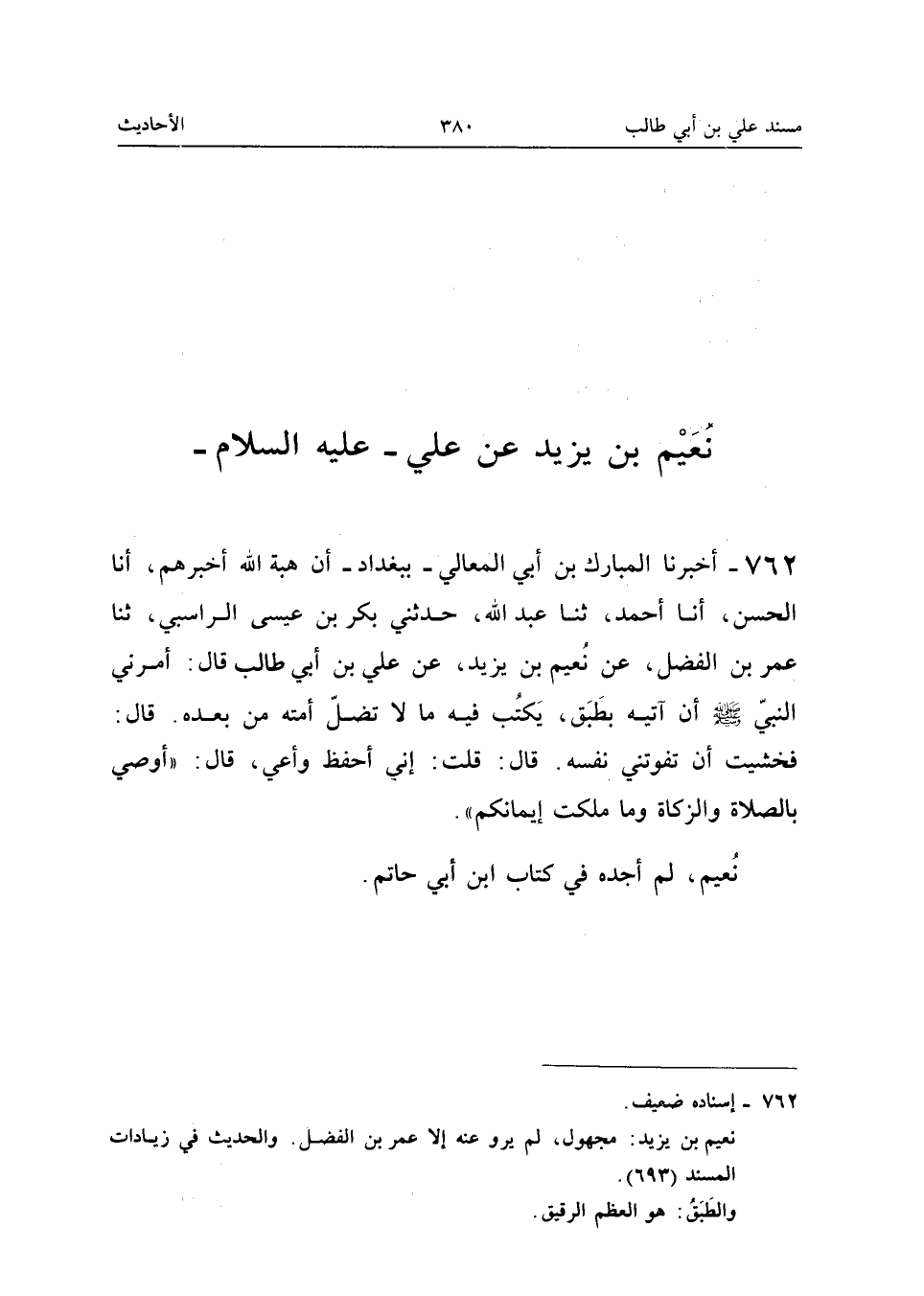 ٧٦٢ - أَخْبَرَنَا الْمُبَارَكُ بْنُ أَبِي الْمَعَالِي - بِبَغْدَادَ - أَنَّ هِبَةَ اللهِ أَخْبَرَهُمْ، أَنَا الْحَسَنُ، أَنَا أَحْمَدُ، ثَنَا عَبْدُ اللهِ، حَدَّثَنِي بَكْرُ بْنُ عِيسَى الرَّاسِبِيُّ، ثَنَا عُمَرُ بْنُ الْفَضْلِ، عَنْ نُعَيْمِ بْنِ يَزِيدَ، عَنْ عَلِيِّ بْنِ أَبِي طَالِبٍ قَالَ: «أَمَرَنِي النَّبِيُّ -صَلَّى اللهُ عَلَيْهِ وَسَلَّمَ - أَنْ آتِيَهُ بِطَبَقٍ يَكْتُبُ فِيهِ مَا لَا تَضِلُّ أُمَّتُهُ مِنْ بَعْدِهِ، قَالَ: فَخَشِيتُ أَنْ تَفُوتَنِي نَفْسُهُ، قَالَ: قُلْتُ: إِنِّي أَحْفَظُ وَأَعِي، قَالَ: أُوصِي بِالصَّلَاةِ وَالزَّكَاةِ، وَمَا مَلَكَتْ أَيْمَانُكُمْ».