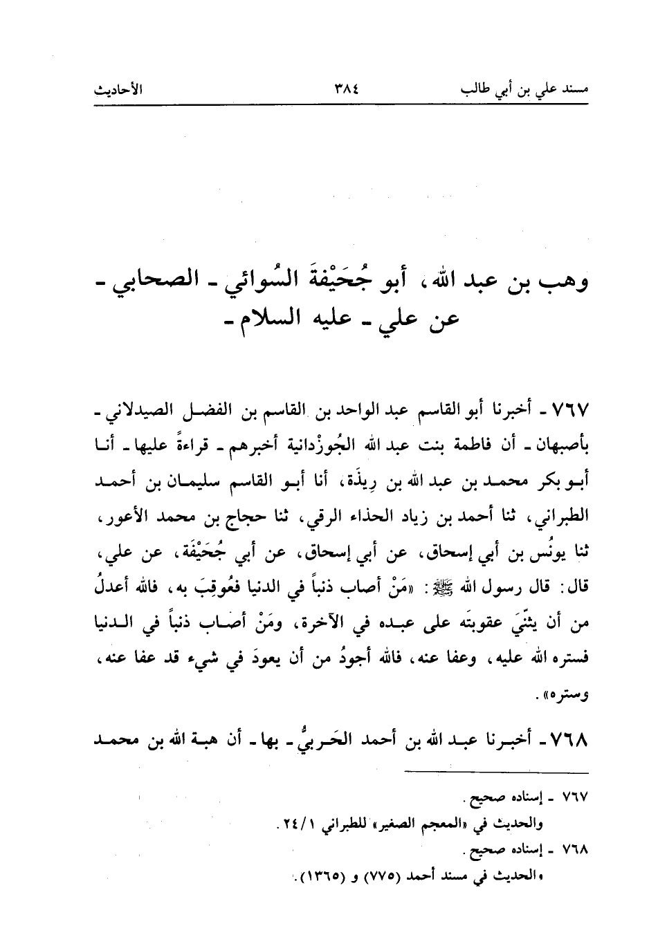 ٧٦٧ - أَخْبَرَنَا أَبُو الْقَاسِمِ عَبْدُ الْوَاحِدِ بْنُ الْقَاسِمِ بْنِ الْفَضْلِ الصَّيْدَلَانِيُّ - بِأَصْبَهَانَ - أَنَّ فَاطِمَةَ بِنْتَ عَبْدِ اللهِ الْجُوزْدَانِيَّةَ أَخْبَرَتْهُمْ - قِرَاءَةً عَلَيْهَا - أَنَا أَبُو بَكْرٍ مُحَمَّدُ بْنُ عَبْدِ اللهِ بْنِ رِيذَةَ، أَنَا أَبُو الْقَاسِمِ سُلَيْمَانُ بْنُ أَحْمَدَ الطَّبَرَانِيُّ، ثَنَا أَحْمَدُ بْنُ زِيَادٍ الْحَذَّاءُ الرَّقِّيُّ، ثَنَا حَجَّاجُ بْنُ مُحَمَّدٍ الْأَعْوَرُ، ثَنَا يُونُسُ بْنُ أَبِي إِسْحَاقَ، عَنْ أَبِي إِسْحَاقَ، عَنْ أَبِي جُحَيْفَةَ، عَنْ عَلِيٍّ قَالَ: قَالَ رَسُولُ اللهِ صَلَّى اللهُ عَلَيْهِ وَسَلَّمَ: «مَنْ أَصَابَ ذَنْبًا فِي الدُّنْيَا فَعُوقِبَ بِهِ، فَاللهُ أَعْدَلُ مِنْ أَنْ يُثَنِّيَ عُقُوبَتَهُ عَلَى عَبْدِهِ فِي الْآخِرَةِ، وَمَنْ أَصَابَ ذَنْبًا فِي الدُّنْيَا فَسَتَرَهُ اللهُ عَلَيْهِ وَعَفَا عَنْهُ، فَاللهُ أَجْوَدُ مِنْ أَنْ يَعُودَ فِي شَيْءٍ قَدْ عَفَا عَنْهُ وَسَتَرَهُ».