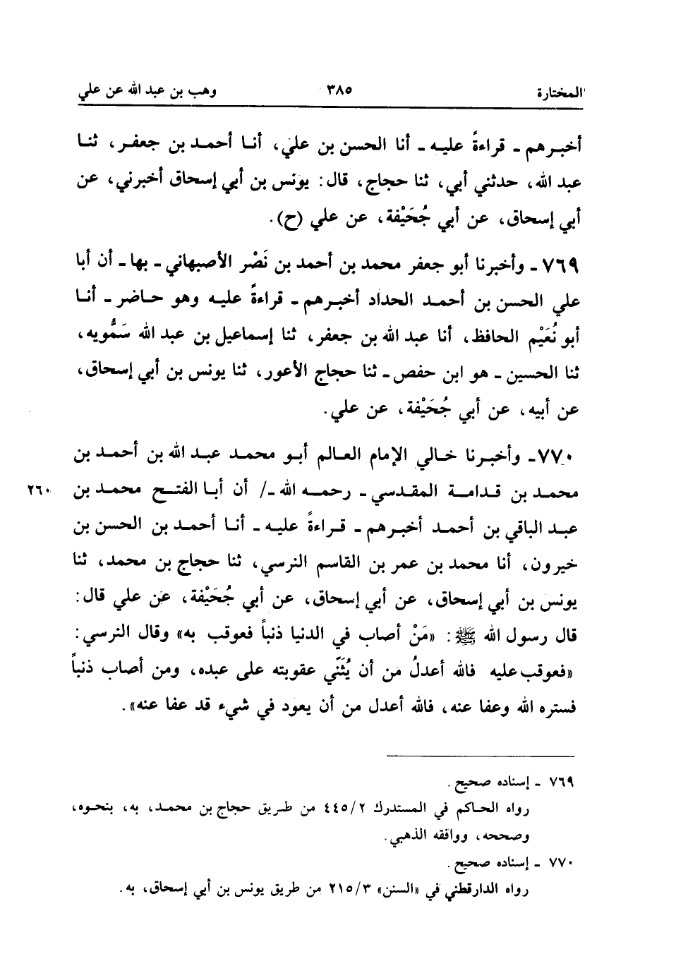 ٧٧٠ - وَأَخْبَرَنَا خَالِي الْإِمَامُ الْعَالِمُ أَبُو مُحَمَّدٍ عَبْدُ اللهِ بْنُ أَحْمَدَ بْنِ مُحَمَّدِ بْنِ قُدَامَةَ الْمَقْدِسِيُّ -رَحِمَهُ اللهُ - أَنَّ أَبَا الْفَتْحِ مُحَمَّدَ بْنَ عَبْدِ الْبَاقِي بْنِ أَحْمَدَ أَخْبَرَهُمْ - قِرَاءَةً عَلَيْهِ - أَنَا أَحْمَدُ بْنُ الْحَسَنِ بْنِ خَيْرُونَ، أَنَا مُحَمَّدُ بْنُ عُمَرَ بْنِ الْقَاسِمِ النَّرْسِيُّ، ثَنَا حَجَّاجُ بْنُ مُحَمَّدٍ، ثَنَا يُونُسُ بْنُ أَبِي إِسْحَاقَ، عَنْ أَبِي إِسْحَاقَ، عَنْ أَبِي جُحَيْفَةَ، عَنْ عَلِيٍّ قَالَ: قَالَ رَسُولُ اللهِ صَلَّى اللهُ عَلَيْهِ وَسَلَّمَ: «مَنْ أَصَابَ فِي الدُّنْيَا ذَنْبًا فَعُوقِبَ بِهِ - وَقَالَ النَّرْسِيُّ: فَعُوقِبَ عَلَيْهِ - فَاللهُ أَعْدَلُ مِنْ أَنْ يُثَنِّيَ عُقُوبَتَهُ عَلَى عَبْدِهِ، وَمَنْ أَصَابَ ذَنْبًا فَسَتَرَهُ اللهُ وَعَفَا عَنْهُ، فَاللهُ أَعْدَلُ مِنْ أَنْ يَعُودَ فِي شَيْءٍ قَدْ عَفَا عَنْهُ.»