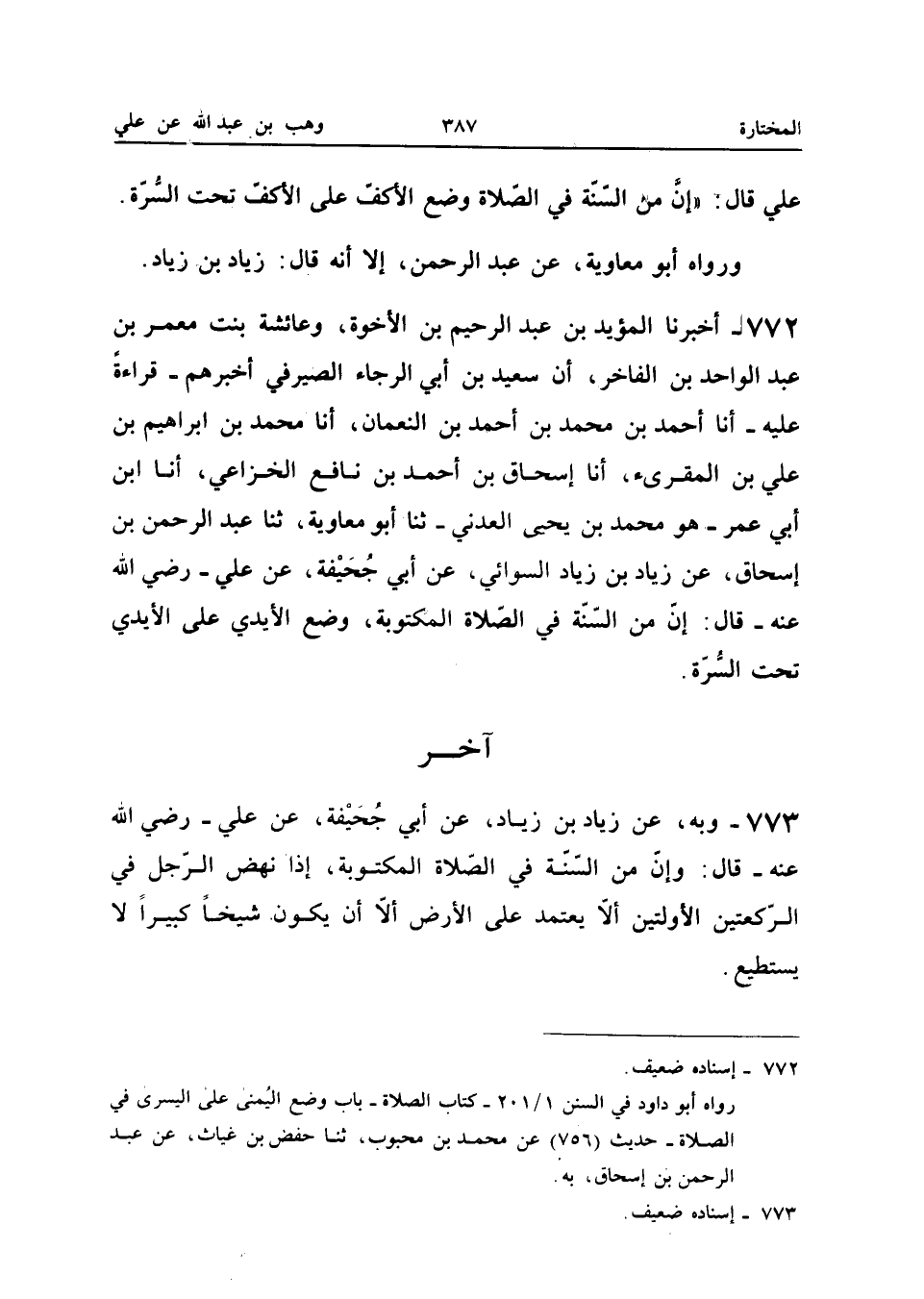 ٧٧٣ - وَبِهِ، عَنْ زِيَادِ بْنِ زِيَادٍ (¬١)، عَنْ أَبِي جُحَيْفَةَ، عَنْ عَلِيٍّ -رَضِيَ اللهُ عَنْهُ - قَالَ: «وَإِنَّ مِنَ السُّنَّةِ فِي الصَّلَاةِ الْمَكْتُوبَةِ إِذَا نَهَضَ الرَّجُلُ فِي الرَّكْعَتَيْنِ الْأُولَيَيْنِ أَلَّا يَعْتَمِدَ عَلَى الْأَرْضِ إِلَّا أَنْ يَكُونَ شَيْخًا كَبِيرًا لَا يَسْتَطِيعُ».