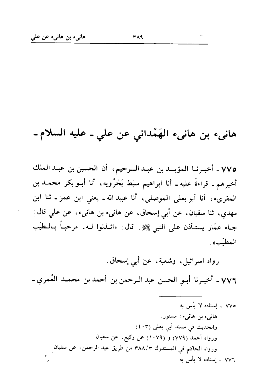 ٧٧٥ - أَخْبَرَنَا الْمُؤَيَّدُ بْنُ عَبْدِ الرَّحِيمِ، أَنَّ الْحُسَيْنَ بْنَ عَبْدِ الْمَلِكِ أَخْبَرَهُمْ - قِرَاءَةً عَلَيْهِ - أَنَا إِبْرَاهِيمُ سِبْطُ بَحْرَوَيْهِ، أَنَا أَبُو بَكْرٍ مُحَمَّدُ بْنُ الْمُقْرِئِ، أَنَا أَبُو يَعْلَى الْمَوْصِلِيُّ، أَنَا عُبَيْدُ اللهِ -يَعْنِي ابْنَ عُمَرَ - ثَنَا ابْنُ مَهْدِيٍّ، ثَنَا سُفْيَانُ، عَنْ أَبِي إِسْحَاقَ، عَنْ هَانِئِ بْنِ هَانِئٍ، عَنْ عَلِيٍّ قَالَ: «جَاءَ عَمَّارٌ يَسْتَأْذِنُ عَلَى النَّبِيِّ -صَلَّى اللهُ عَلَيْهِ وَسَلَّمَ - قَالَ: ائْذَنُوا لَهُ مَرْحَبًا بِالطَّيِّبِ الْمُطَيَّبِ».