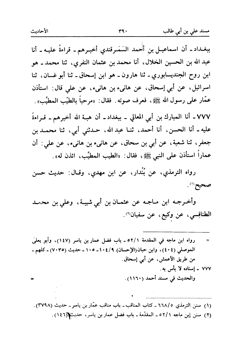 ٧٧٧ - أَنَا الْمُبَارَكُ بْنُ أَبِي الْمَعَالِي - بِبَغْدَادَ - أَنَّ هِبَةَ اللهِ أَخْبَرَهُمْ - قِرَاءَةً عَلَيْهِ - أَنَا الْحَسَنُ، أَنَا أَحْمَدُ، ثَنَا عَبْدُ اللهِ، حَدَّثَنِي أَبِي، ثَنَا مُحَمَّدُ بْنُ جَعْفَرٍ، ثَنَا شُعْبَةُ، عَنْ أَبِي إِسْحَاقَ، عَنْ هَانِئِ بْنِ هَانِئٍ، عَنْ عَلِيٍّ: «أَنَّ عَمَّارًا اسْتَأْذَنَ عَلَى النَّبِيِّ -صَلَّى اللهُ عَلَيْهِ وَسَلَّمَ - فَقَالَ: الطَّيِّبُ الْمُطَيَّبُ؟ ائْذَنْ لَهُ».