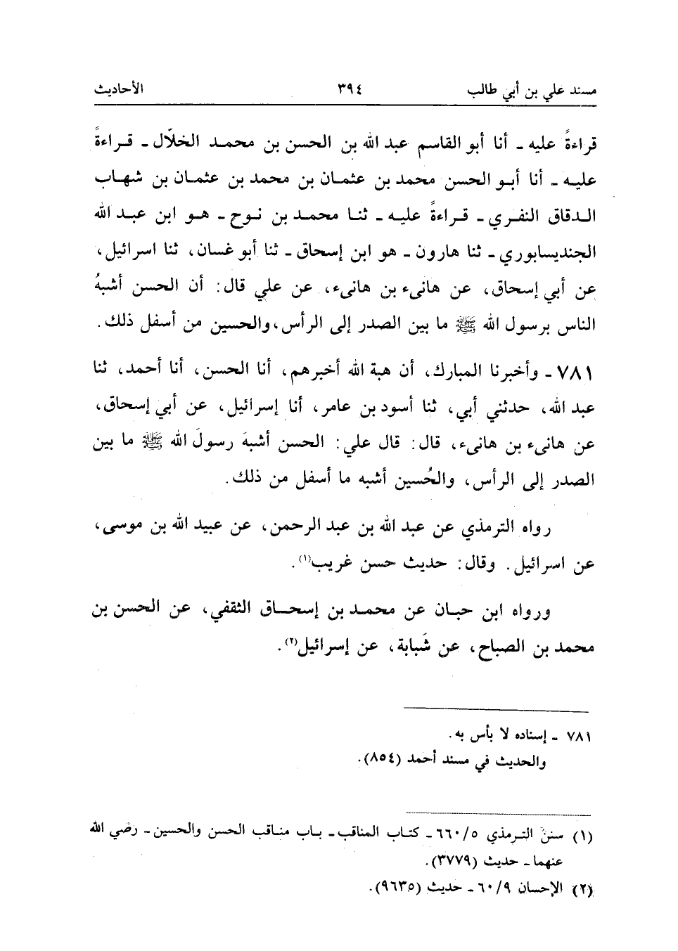 ٧٨١ - وَأَخْبَرَنَا الْمُبَارَكُ، أَنَّ هِبَةَ اللهِ أَخْبَرَهُمْ، أَنَا الْحَسَنُ، أَنَا أَحْمَدُ، ثَنَا عَبْدُ اللهِ، حَدَّثَنِي أَبِي، ثَنَا أَسْوَدُ بْنُ عَامِرٍ، أَنَا إِسْرَائِيلُ، عَنْ أَبِي إِسْحَاقَ، عَنْ هَانِئِ بْنِ هَانِئٍ قَالَ: قَالَ عَلِيٌّ: «الْحَسَنُ أَشْبَهَ رَسُولَ اللهِ -صَلَّى اللهُ عَلَيْهِ وَسَلَّمَ - مَا بَيْنَ الصَّدْرِ إِلَى الرَّأْسِ، وَالْحُسَيْنُ أَشْبَهَ مَا أَسْفَلَ مِنْ ذَلِكَ».