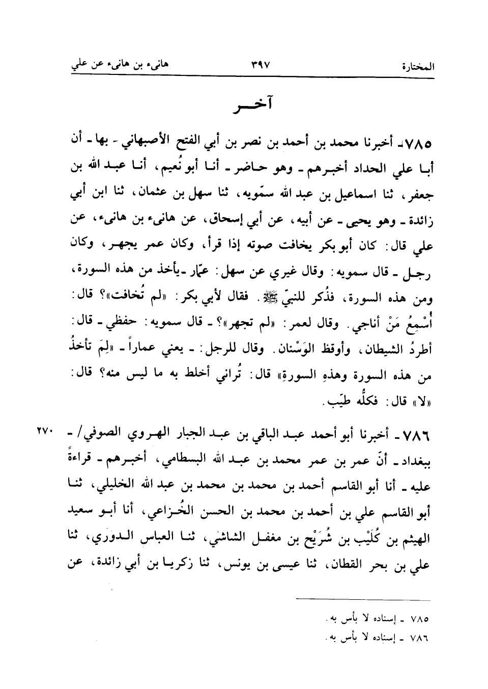 ٧٨٥ - أَخْبَرَنَا مُحَمَّدُ بْنُ أَحْمَدَ بْنِ نَصْرِ بْنِ أَبِي الْفَتْحِ الْأَصْبَهَانِيُّ بِهَا، أَنَّ أَبَا عَلِيٍّ الْحَدَّادَ أَخْبَرَهُمْ وَهُوَ حَاضِرٌ، أَنَا أَبُو نُعَيْمٍ، أَنَا عَبْدُ اللهِ بْنُ جَعْفَرٍ، ثَنَا إِسْمَاعِيلُ بْنُ عَبْدِ اللهِ سَمُّويَهْ، ثَنَا سَهْلُ بْنُ عُثْمَانَ، ثَنَا ابْنُ أَبِي زَائِدَةَ - وَهُوَ يَحْيَى - عَنْ أَبِيهِ، عَنْ أَبِي إِسْحَاقَ، عَنْ هَانِئِ بْنِ هَانِئٍ، عَنْ عَلِيٍّ قَالَ: «كَانَ أَبُو بَكْرٍ يُخَافِتُ صَوْتَهُ إِذَا قَرَأَ، وَكَانَ عُمَرُ يَجْهَرُ، وَكَانَ رَجُلٌ - قَالَ سَمُّويَهِ: وَقَالَ غَيْرِي عَنْ سَهْلٍ: عَمَّارٌ - يَأْخُذُ مِنْ هَذِهِ السُّورَةِ وَمِنْ هَذِهِ السُّورَةِ، فَذُكِرَ لِلنَّبِيِّ - صَلَّى اللهُ عَلَيْهِ وَسَلَّمَ - فَقَالَ لِأَبِي بَكْرٍ: لِمَ تُخَافِتُ؟ قَالَ: أُسْمِعُ مَنْ أُنَاجِي، وَقَالَ لِعُمَرَ: لِمَ تَجْهَرُ؟ - قَالَ سَمُّويَهْ: حِفْظِي - قَالَ: أَطْرُدُ الشَّيْطَانَ وَأُوقِظُ الْوَسْنَانَ. وَقَالَ لِلرَّجُلِ - يَعْنِي عَمَّارًا - لِمَ تَأْخُذُ مِنْ هَذِهِ السُّورَةِ وَهَذِهِ السُّورَةِ؟ قَالَ: تُرَانِي أَخْلِطُ بِهِ مَا لَيْسَ مِنْهُ؟ قَالَ: لَا. قَالَ: فَكُلُّهُ طَيِّبٌ».